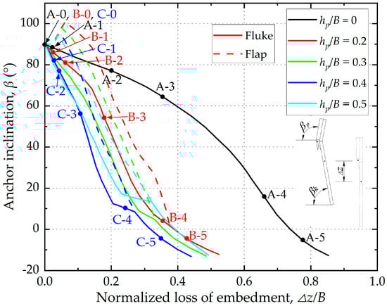 Although all anchors exhibited similar overall rotational patterns, the vertical displacement required to achieve the same rotation varied significantly. The anchor without flaps (hp/B = 0) required the largest Δz/B, indicating lower rotational efficiency, i.e., requiring greater embedment loss (Δz/B) to mobilize rotation to a given inclination angle (β), compared with anchors equipped with inwardly rotating flaps. In contrast, anchors fitted with inwardly rotating flaps (hp/B = 0.2–0.5) reached comparable inclination angles at smaller vertical displacements, demonstrating that flap activation enhances the rotational efficiency of the fluke and reduces embedment loss. The anchor with hp/B = 0.4 exhibited the highest rotational efficiency, achieving the same inclination angle with the least loss of embedment.