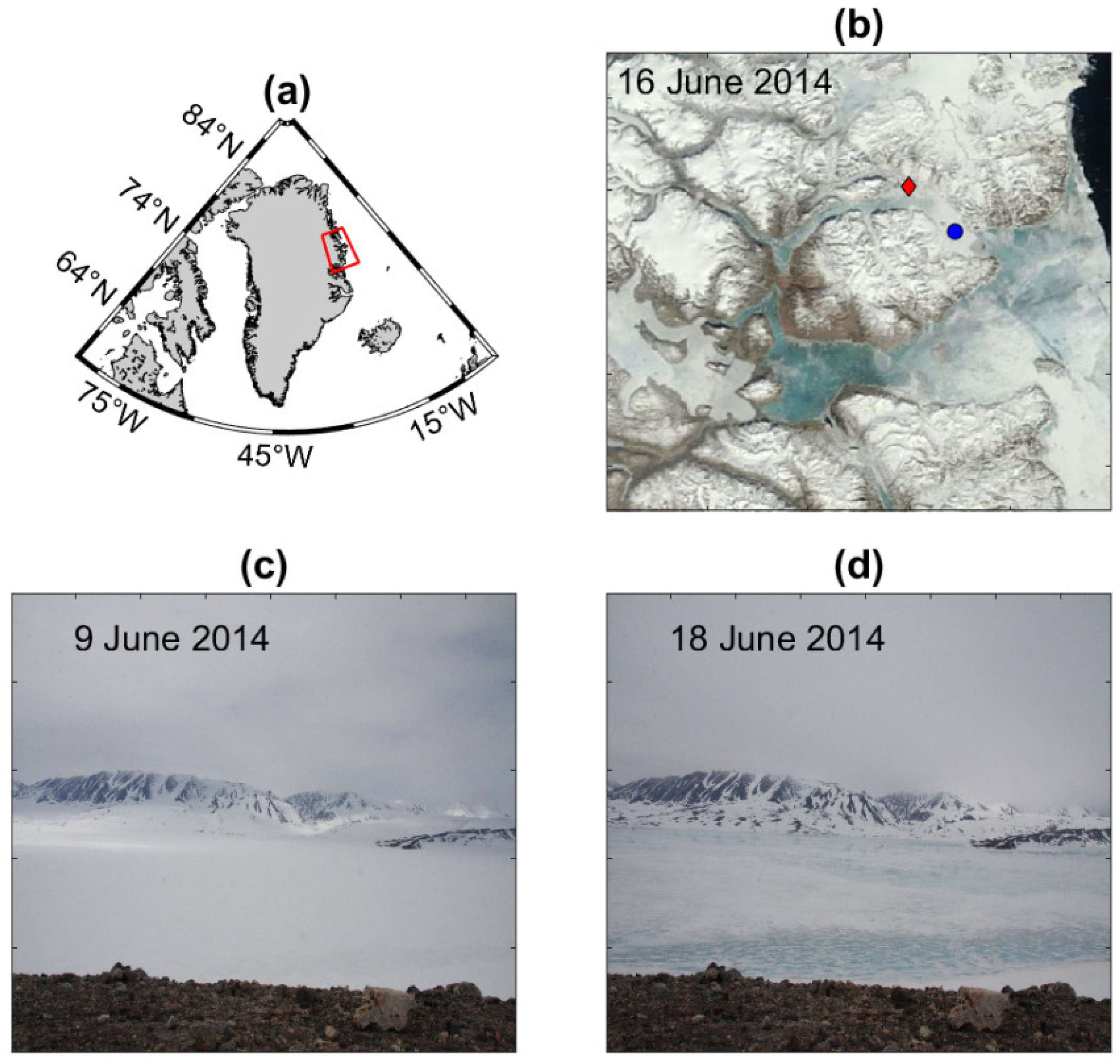 Figure 1. (a) Study area in Young Sound-Tyrolerfjord, Northeast Greenland (74° N, 20° E), indicated by the red box. (b) Satellite image from 16 June 2014 (Landsat 8), showcasing the fjord’s sea ice and snow cover at the time of the field campaign. The blue dot on this image highlights the under-ice sampling location of the CONTROS HydroC® CO2 and SBE37SM. The red diamond represents the outlet location of Zackenberg river. (c,d) Time lapse photographs capturing onset of sea ice melt (9 June 2014) and the formation of melt ponds on the sea ice’s surface (18 June 2014).