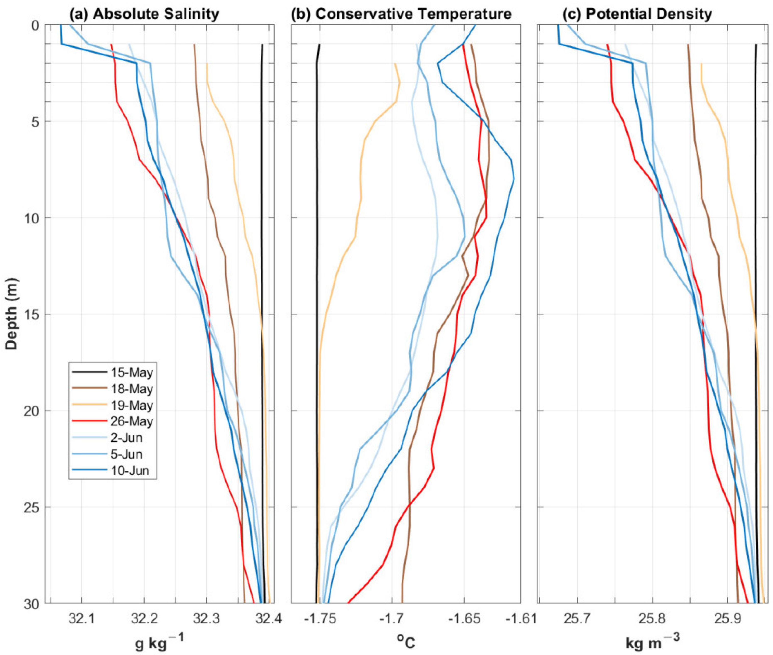 Vertical profiles of SA and CT show a well-mixed water column in the upper 30 m on May 15 with SA of 32.38 g kg−1 and CT at near freezing point of −1.75 °C (Figure 2a,b). These profiles are representative of the hydrographic settings before the onset of snow and sea ice melt. By the end of May, SA decreased in the upper 30 m with the lowest values at the sea surface (SA = 32.19 g kg−1), while CT increased to −1.68 °C/−1.65 °C, reflecting the onset of snow and sea ice melt. These changes in SA and CT resulted in a stratified water column (Figure 2c).