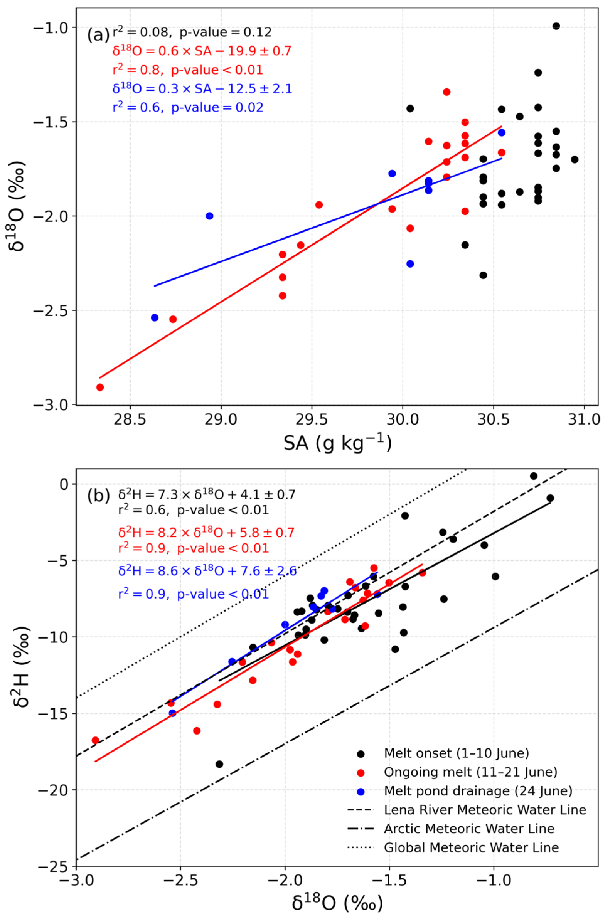 Figure 4. (a) The δ18O (‰) values as a function of absolute salinity (SA) for the melt onset period (black dots, n = 28), ongoing melt (red dots, n = 20), and drainage of melt pond water (blue dots, n = 8). (b) The δ2H (‰) as a function of δ18O (‰) values. The dashed, dash-dotted, and dotted lines indicate potential sources of meteoric water for the under-ice seawater in YS.