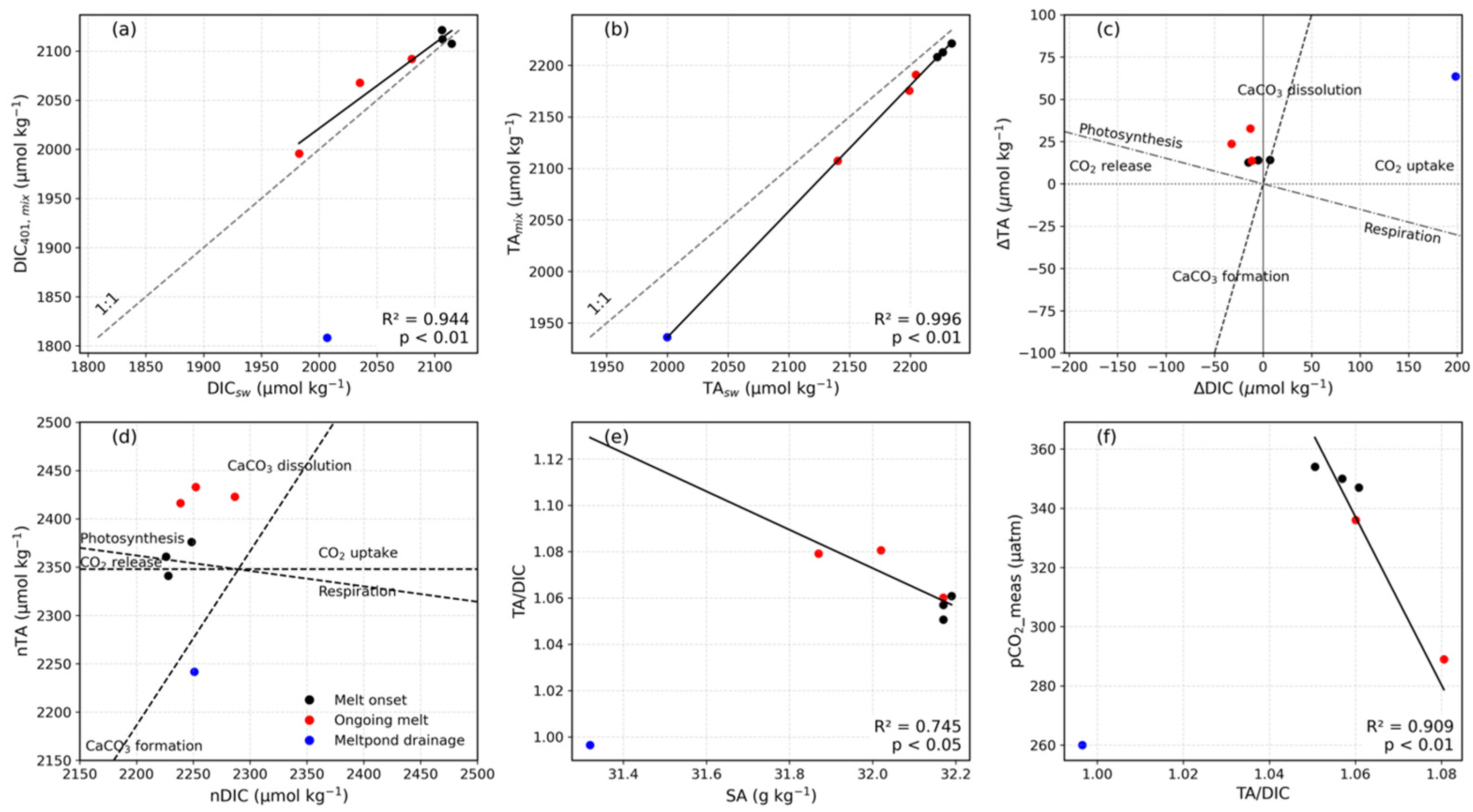 Figure 5. Relationships between (a) measured DIC (DICsw) and DIC401,mix, (b) measured TA (TAsw) and TAmix, (c) DIC (∆DIC) and TA residual (∆TA), (d) nDIC and nTA (normalized at Sref = 32.38 g kg−1). The different dashed lines in panel (c,d) represent the theoretical evolution of nTA/nDIC ratio and residuals following the precipitation/dissolution of calcium carbonate, release/uptake of CO2(g) and biological photosynthesis/respiration. (e) Relationship between the TA/DIC ratio and SA (g kg−1), and (f) between the TA/DIC ratio and measured pCO2 (pCO2_meas).