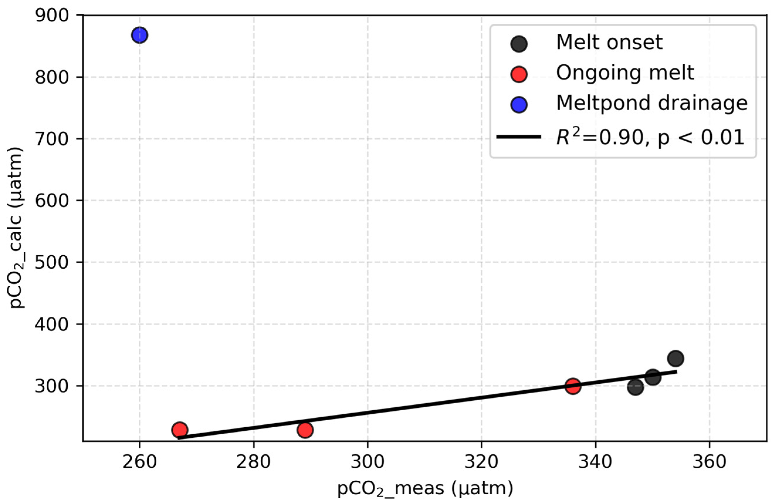 In this study, we investigate the role of snow and sea ice melt, melt pond water drainage, seawater mixing, and primary production in driving pCO2 variability during the summer thaw. Using a unique, high-frequency dataset of pCO2, salinity, and temperature collected at 2.5 m below the snow-covered sea ice—complemented by carbonate chemistry measurements in snow, sea ice, and seawater over a 30-day melt period—we provide new insights into processes driving pCO2 reduction, which is crucial for understanding the CO2 uptake capacity of surface seawater after sea ice breaks up.