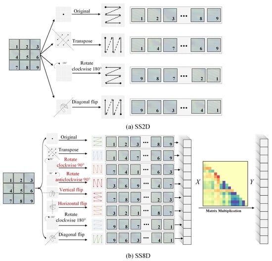 (a) Original SS2D using four basic scanning directions. (b) Proposed SS8D incorporating eight directional transformations for enhanced spatial dependency modeling and richer contextual feature extraction.