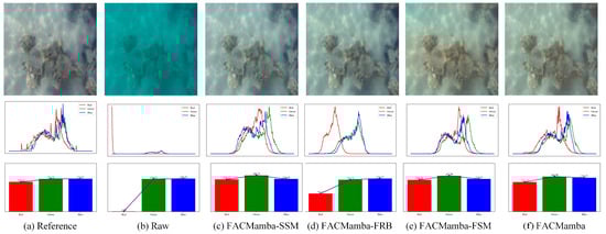 Analysis of MVSM. To evaluate the effectiveness of SS8D, we replace it with the standard SS2D, yielding the variant FACMamba-SSM. Compared to FACMamba-SSM, the full FACMamba achieves a 0.08 dB gain in PSNR (23.53 dB vs. 23.45 dB), a 0.002 increase in SSIM (0.920 vs. 0.918), and higher perceptual scores in UIQM (3.011 vs. 2.977) and UCIQE (0.572 vs. 0.550). Although FACMamba contains 1.11M more parameters than FACMamba-SSM, this slight increase represents a reasonable trade-off for the observed accuracy gains. More importantly, the visual improvements are considerably more noticeable than the numerical differences suggest. As illustrated in Figure 4, it can be found that the image produced by FACMamba-SSM remains visually dull and lacks contrast, with an RGB histogram exhibiting low red-channel intensity and compressed color variation. In contrast, FACMamba generates a more vivid image with stronger edge definition, a more balanced RGB curve, and average brightness closer to the reference. This confirms that SS8D captures richer global context and long-range dependencies, thereby offering advantages in color correction and visual clarity.