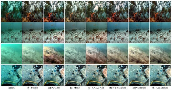 To remain consistent with mainstream algorithms, we evaluate the proposed network using MSE, PSNR [], SSIM [], UIQM [], UCIQE, and NIQE []. The source code for our FACMamba can be fetched at: https://github.com/wwaannggllii/FACMamba (accessed on 17 October 2025).
