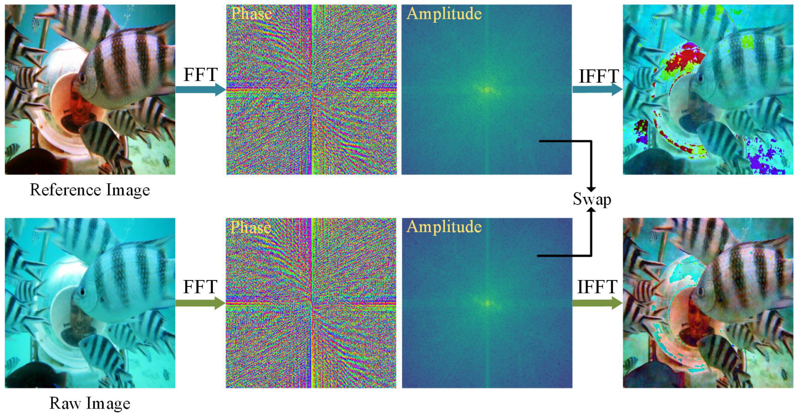 - Zhao, C.; Cai, W.; Dong, C.; Hu, C. Wavelet-based Fourier Information Interaction with Frequency Diffusion Adjustment for Underwater Image Restoration. In Proceedings of the 2024 IEEE/CVF Conference on Computer Vision and Pattern Recognition (CVPR), Seattle, WA, USA, 16–22 June 2024; pp. 8281–8291. [Google Scholar] [CrossRef]