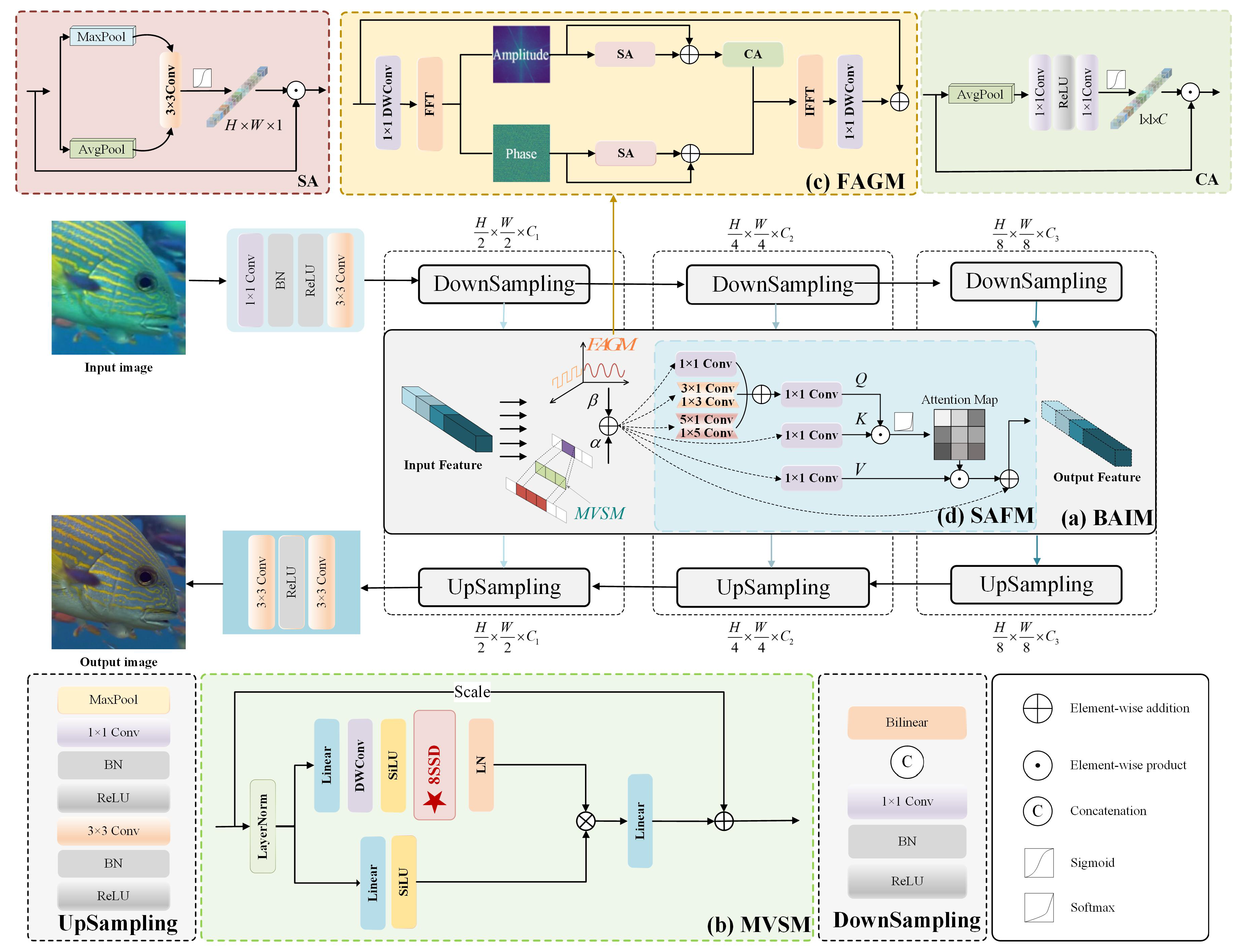 - To address the inefficiency of global modeling and detail enhancement in UIE tasks, a novel state-space-based U-Net architecture named FACMamba is proposed. FACMamba integrates a lightweight yet expressive Bidirectional Awareness Integration Module (BAIM) between the encoder and decoder stages to facilitate efficient bidirectional information flow across scales. Such a design allows the network to effectively integrate frequency-domain information with long-range spatial modeling, all within a framework of linear computational complexity.