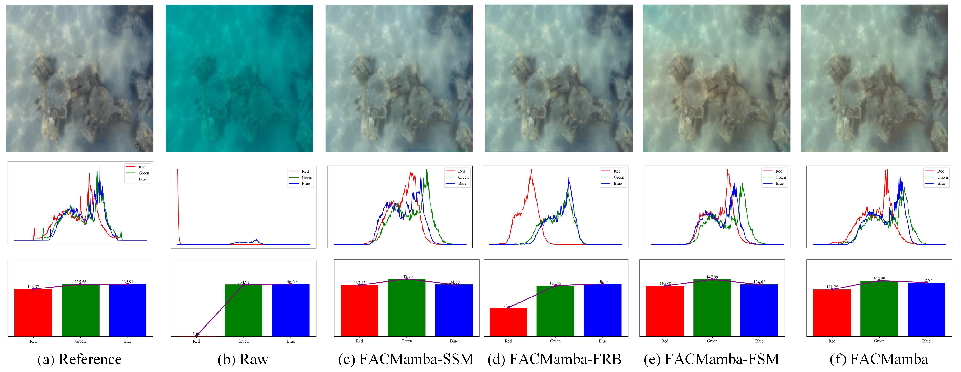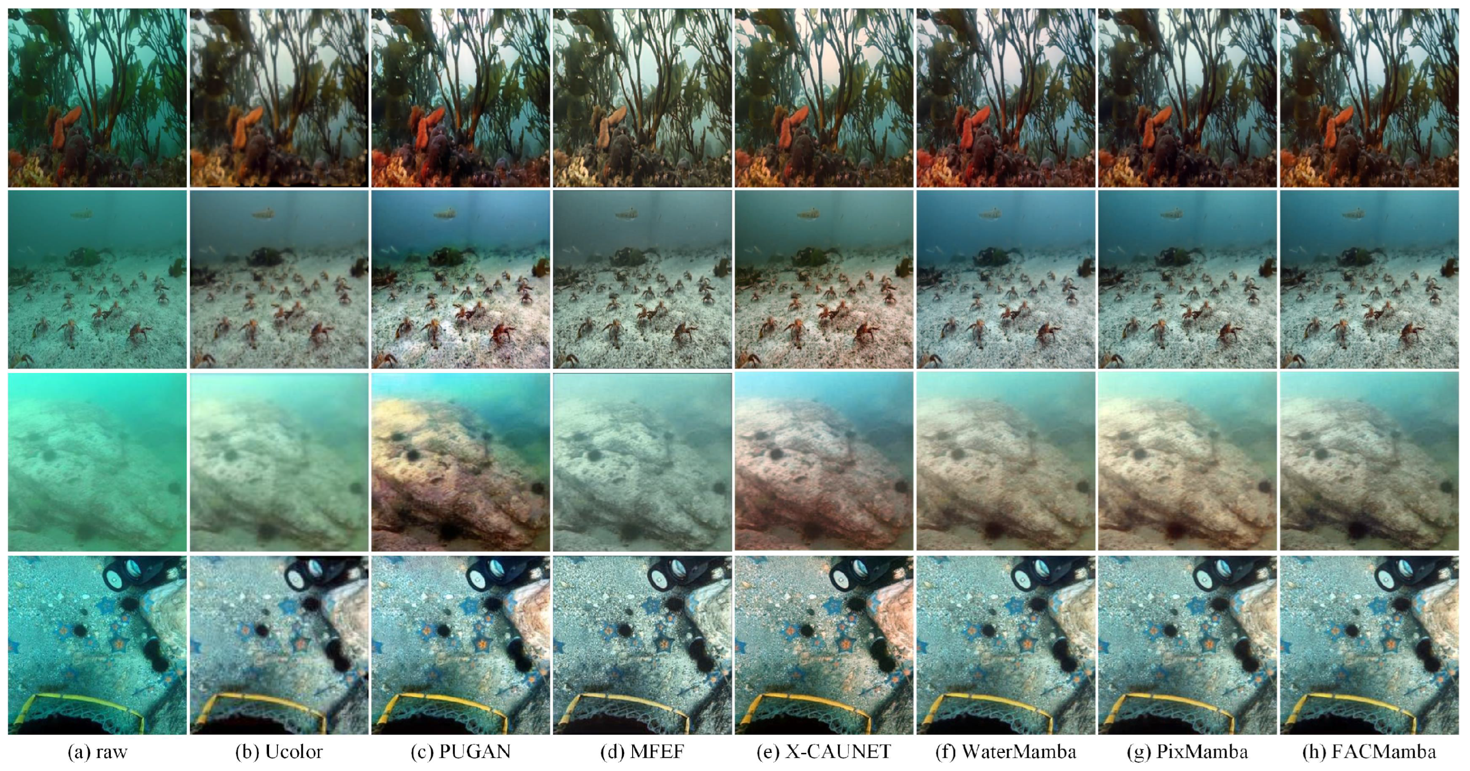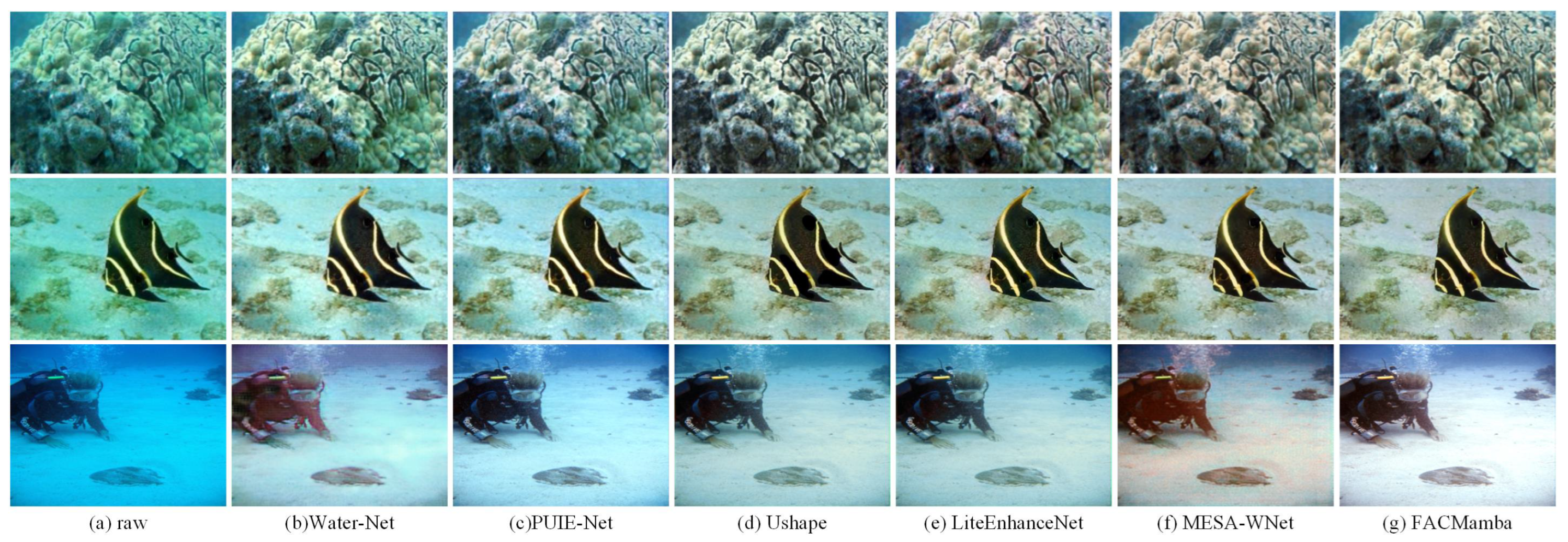 | Water-Net | PUIE-Net | U-Shape | LiteEnhanceNet | MESA-WNet | WaterMamba | PixMamba | FACMamba (Ours) | |