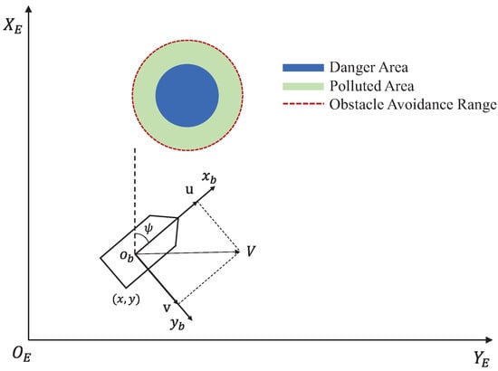 Intelligent USVs, which have emerged alongside advancements in artificial intelligence technologies, represent a new platform for marine monitoring [8,9,10,11,12]. Compared to traditional environmental monitoring vessels, USVs offer several advantages, including lower costs, high autonomy and flexibility, and a wider operational range. These features make them a promising next-generation technology for marine environmental monitoring. However, achieving precise control of USVs in complex marine environments remains a challenging issue. And this challenge mainly comes from the underactuated characteristics of USVs, the uncertain dynamics of the system, and unknown external disturbances. Currently, most USVs are underactuated structures, meaning their control input is less than their degrees of freedom. In [13], a distributed bearing-based formation control scheme with finite-time convergence is proposed for multiple underactuated USVs. By employing a guidance-point-based model transformation method, the dimension of the underactuated tracking error dynamics can be reduced from three to two. In [14], the trajectory tracking problem of underactuated USVs subject to input saturation, unmodeled dynamics, and marine environmental disturbances is investigated. A coordinate transformation is constructed to address the under-actuation issue of USVs, and a new event-triggered condition is introduced to significantly reduce control execution frequency and transmission load. In [15], a robust collision-avoidance formation navigation problem for multiple USVs is addressed, where USVs are modeled as underactuated nonlinear systems subject to state and input constraints. A novel distributed model predictive control (MPC)-based controller is developed to achieve collision-free formation navigation. Furthermore, a class of distributed collision-avoidance formation navigation strategies is proposed and utilized, allowing the control inputs of USVs to be determined synchronously. In [16], a prescribed performance path-following control algorithm for USVs is proposed, which employs an output-based threshold rule and a shift function to perform parallel maritime search tasks. In the guidance module, a finite-boundary-based guidance principle is developed, and a position threshold rule is adopted to avoid continuous computation of heading reference signals.