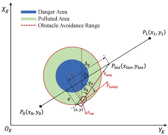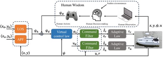 It is important to note that in this article, human actions do not directly control the USVs’ movements, specifically the torque. Instead, human control is achieved by adjusting the desired heading angle of the USVs. This approach aligns more closely with human operational habits compared to existing methods [32]. Additionally, we implement a LOS navigation strategy based on the potential field method, which helps mitigate potential safety risks associated with human actions.