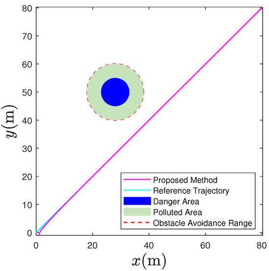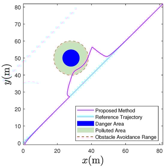 In this section, we conduct simulation experiments to verify the feasibility of the proposed adaptive fuzzy control strategy. The USV model chosen for this test is based on the work of [46]. The model parameters are shown in Table 1. The expected speed of the USV is set to 0.5 m/s, with an initial position of (1, −1) and an initial speed of 0. The waypoints for the reference path are set at (0, 0) and (80, 80). We have designated a blue danger zone with a radius of 5 m, centered around the coordinates (28, 50), and a circular green pollution zone that extends 5 m beyond the danger zone. The fuzzy system nodes for both the velocity and heading angle subsystems consist of 11 nodes, with the center points of the Gaussian functions evenly distributed within the range of [ 3 , 3 ] and a width of 0.5. The initial fuzzy weights are all 0. The control parameters are k 1 = 50 , k 2 = 4 , k 3 = 10 , k 4 = 10 , k 5 = 30 , l 1 = 10 , l 2 = 10 , l 3 = 0.1 , η u = 2 , η r = 20 , k a p = 1 , k r p = 1 , a u = 50 , a r = 50 .