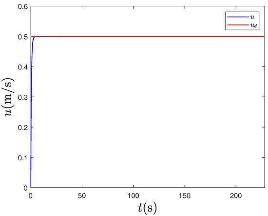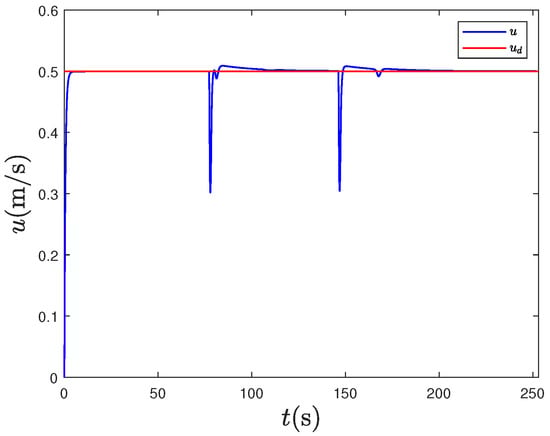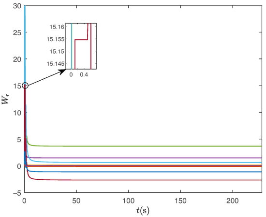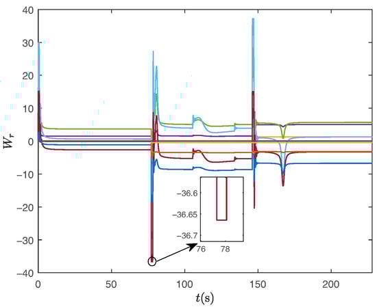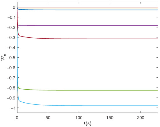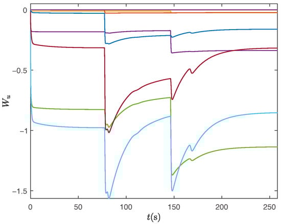 Under the same control parameters, we simulate the tracking of the expected path without human intervention. The experimental results are presented in Figure 12, Figure 13, Figure 14, Figure 15, Figure 16 and Figure 17. Figure 12 illustrates the tracking path of the unmanned surface vehicles, demonstrating their effective tracking of the expected route. Figure 13 and Figure 14 depict the tracking of the heading angle and surge velocity. Notably, there are significant tracking errors during the initial stage. However, as adaptive parameters are trained, the tracking error decreases rapidly. Figure 15 shows the curve of the control input signal. Meanwhile, Figure 16 and Figure 17 illustrate the changes in fuzzy weights. It is evident that as the tracking error diminishes, both the velocity weight and heading angle weight remain within a specific range. By comparing the two results above, it is clear that human intelligence can enhance the performance of unmanned ships in functions like ocean environment monitoring. Additionally, our design approach, which separates navigation from control, effectively minimizes the impact of human actions on the stability of these unmanned vessels. The verification results demonstrate that the control strategy proposed in this paper ensures the stability of unmanned ships, whether human actions are introduced or removed.