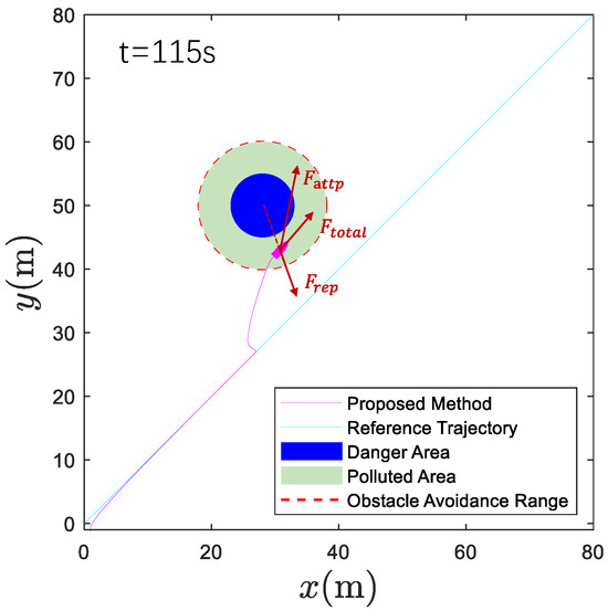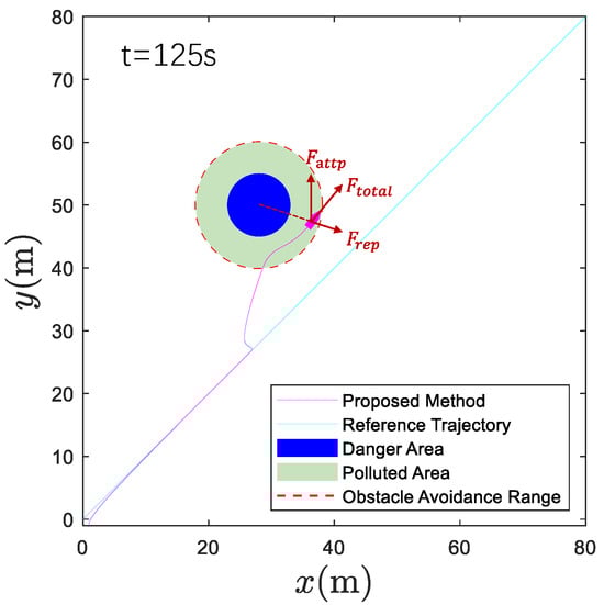 To further analyze the performance of the controller during obstacle avoidance, we select two critical moments in the obstacle avoidance process for detailed examination. In Figure 10, we observe that as the USV enters the avoidance radius of the polluted area, the obstacle avoidance maneuver is automatically initiated through the APF algorithm. The sudden change in the heading angle command results in a smooth but significant adjustment in the USV’s trajectory, demonstrating the rapid response capability of our control system. In Figure 11, we can see that when the USV has successfully navigated around the core hazardous zone, it begins to return toward the original desired path while maintaining a safe distance from the polluted area. These two figures collectively illustrate that the guidance algorithm has successfully executed the obstacle avoidance function, while the control algorithm effectively tracks the abrupt angle changes that occur during this process, thereby verifying the effectiveness of our proposed APF-based navigation strategy.