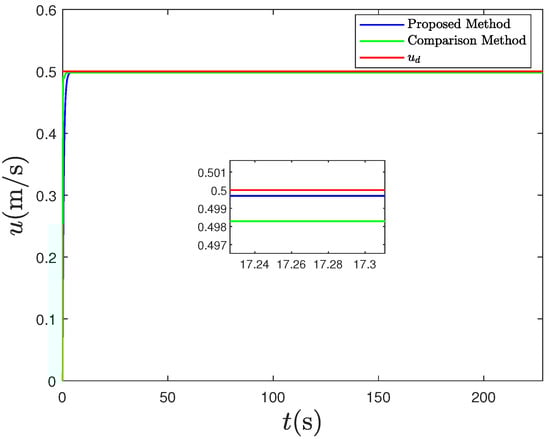 To demonstrate the advantages of our control strategy, we compare our controller with the traditional adaptive fuzzy control strategy in reference [47]. The control parameters used in reference [47] are the same as those in our controller. The comparison results are shown in Figure 18, Figure 19 and Figure 20, and the system performance metrics are shown in Table 2. Our method outperforms the compared methods in both speed control and angle control. For speed control, the value of MAE in our controller is only 4.1 × 10 5 , while the one in the comparison method is 1.8 × 10 3 . In the angle control subsystem, our proposed method reduces the value of MAE from 4.4 × 10 4 to 1.1 × 10 5 when compared to traditional methods.
