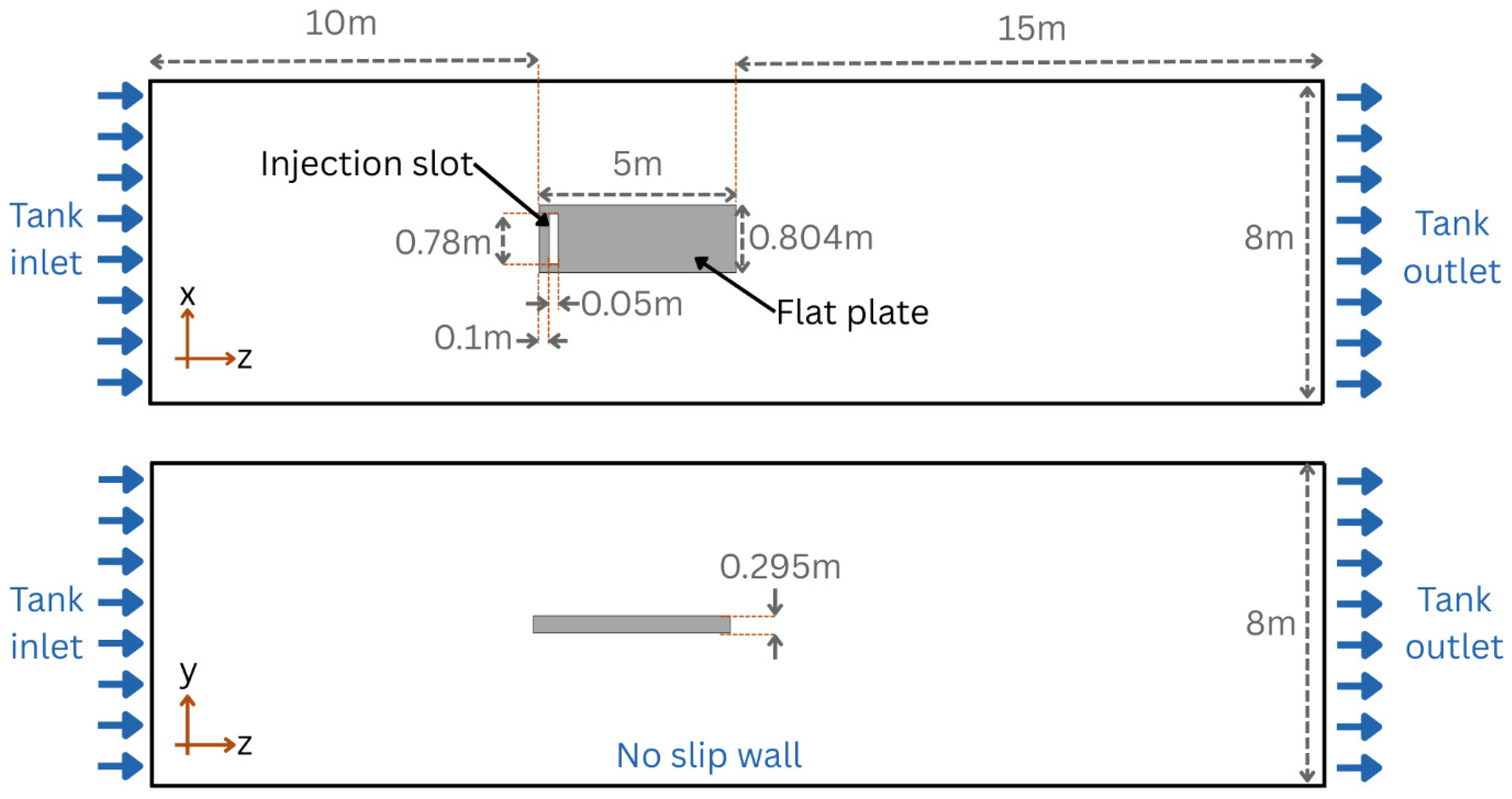 As shown in Figure 1, the flat plate is centrally positioned in the tank, with an upstream length of 10 m and a downstream length of 15 m. Although described here as a flat plate, the model has a finite thickness (T = 0.295 m) to ensure structural strength and realistic boundary-layer development in a three-dimensional domain. The analysis focuses on the lower surface, which behaves as a locally flat wall. This geometry is also practical for future experimental validation, as a plate of finite thickness can be built and tested using the same dimensions and injection setup. The injection slot located 0.1 m (2% L) downstream from near the leading edge on the bot-tom surface of the plate. This position was selected to allow the water injection to interact with the developing boundary layer near the transition region while avoiding the stagnation point at the leading edge. The slot spans, has a span of 0.78 m, corresponding to 97% of the plate width. All other tank boundaries are treated as no-slip walls, while the inlet and outlet are defined by fixed value velocity and zero gradient pressure outlet conditions, respectively. Gravity was enabled in all simulations, acting in the global -y direction, to reproduce the hydrostatic pressure field in water.
