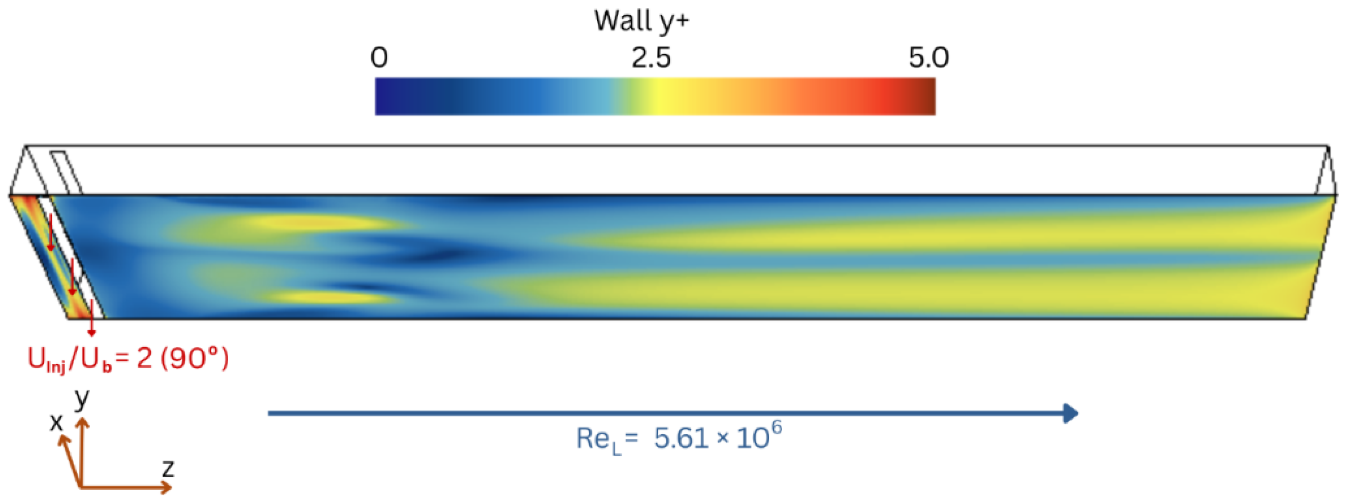 The baseline simulation was performed at a mid-range Reynolds number of 5.61 × 106 (corresponding to a free-stream velocity of 1 m/s or ~1.94 knots), with water injected at twice the free-stream velocity (UInj/Ub = 2) and at 90° to the bottom surface near the upstream end of the plate.