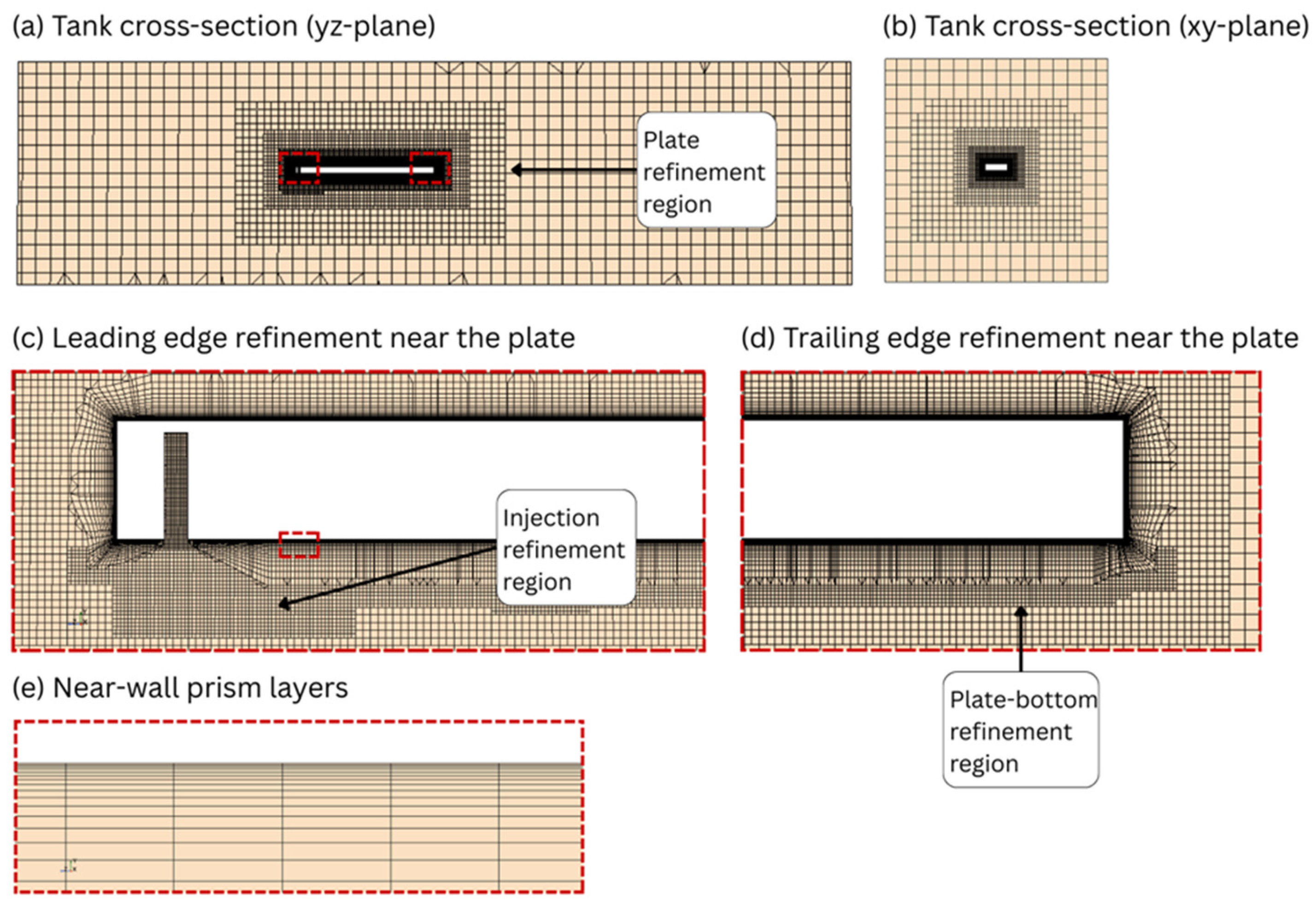 Figure 3. Representative mesh distribution at selected locations: (a) tank cross-section in the yz-plane; (b) tank cross-section in the xy-plane; (c) near the leading edge of the plate; (d) near the trailing edge; and (e) near-wall prism layers.