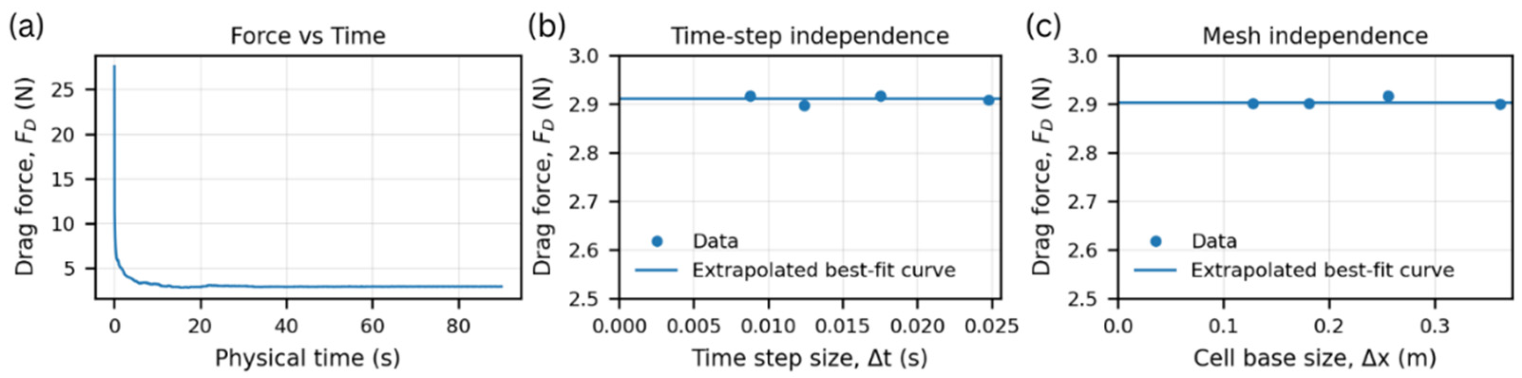Resolution verification was conducted in accordance with the ITTC’s recommended procedures [23]. The drag force on the plate surface was monitored until oscillatory convergence was achieved, which occurred approximately 60 s into the simulated time (Figure 4a). For non-monotonic convergence behaviour, numerical uncertainty was quantified using the least-squares-fit method of [24], which is particularly suited for oscillatory or irregular convergence trends. Both time-step and mesh-size independence studies were performed using four refinement levels. The corresponding results are summarised in Table 4 and Table 5, and the trends are illustrated in Figure 4b,c.
