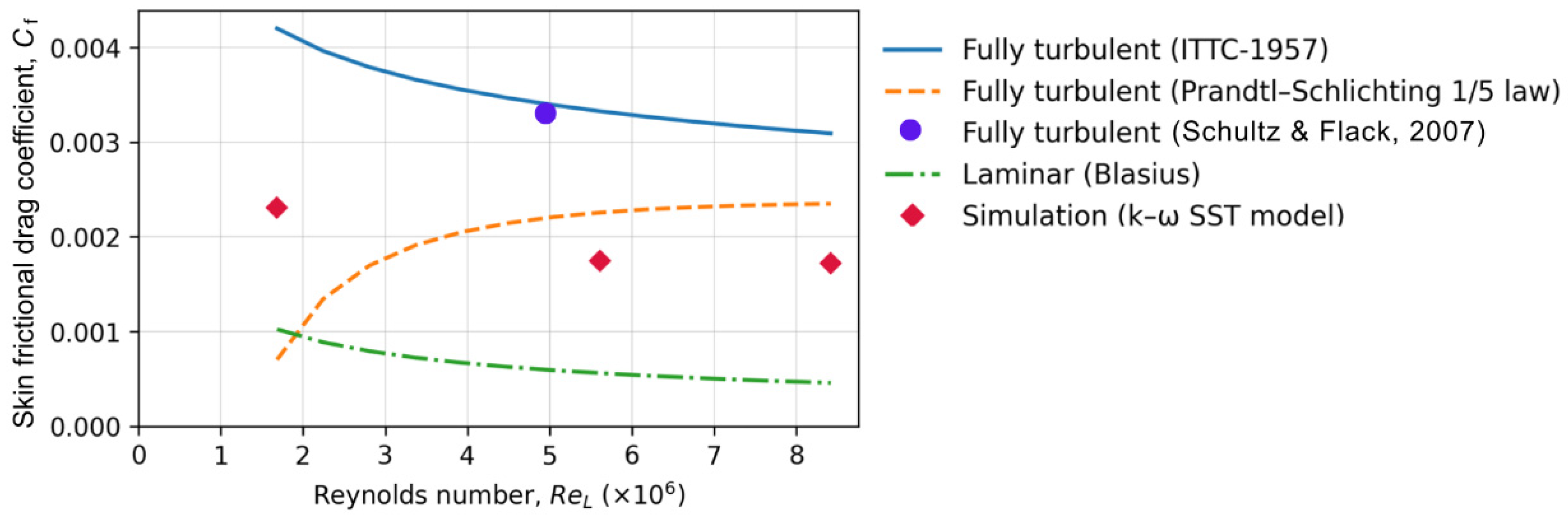 To evaluate the accuracy of the k–ω SST simulations, the predicted skin frictional drag coefficients of a smooth flat plate were benchmarked against classical analytical and empirical correlations for zero-pressure-gradient boundary layers. The Blasius laminar solution represents the theoretical lower limit of Cf. In contrast, the ITTC-1957 correlation [25] and the Prandtl–Schlichting 1/5th power law [26] provide upper bounds corresponding to a fully turbulent boundary layer from the leading edge.