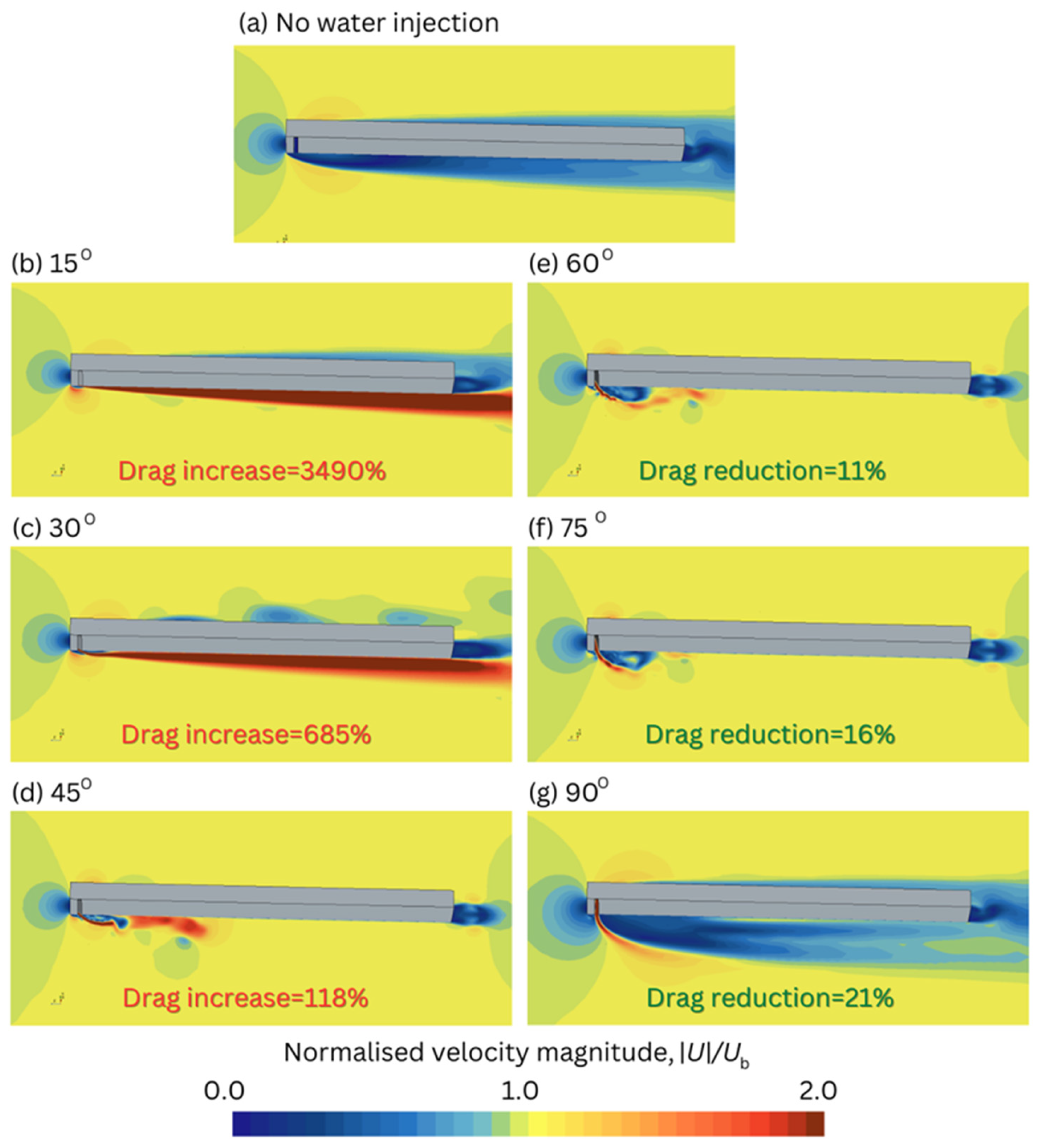 Research on the role of injection angle in water jet drag reduction remains limited. Perpendicular (90°) injection has been examined in earlier work [10], while more recent studies have explored angles from 90° down to 30°, showing that angle variation can influence drag reduction performance [11].