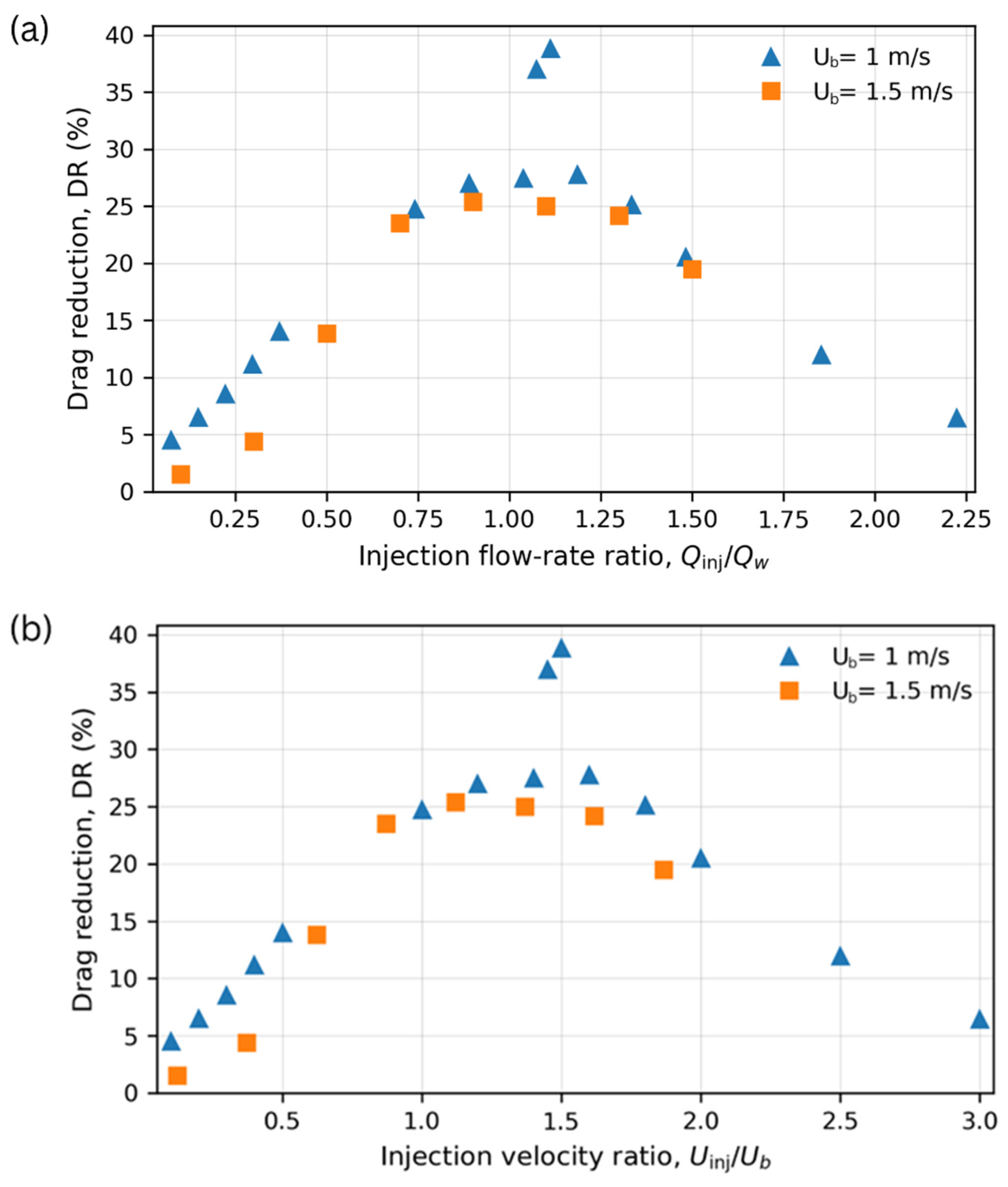 To further examine this behaviour, Figure 8 compares the drag reduction at U b = 1.0 m/s for the optimum injection flow-rate ratio ( Q I n j / Q w = 1.1, from Figure 7a) and the optimum injection velocity ratio ( U I n j / U b = 1.5, from Figure 7b) across different Reynolds numbers. The corresponding values are tabulated in Table A5 in Appendix B.