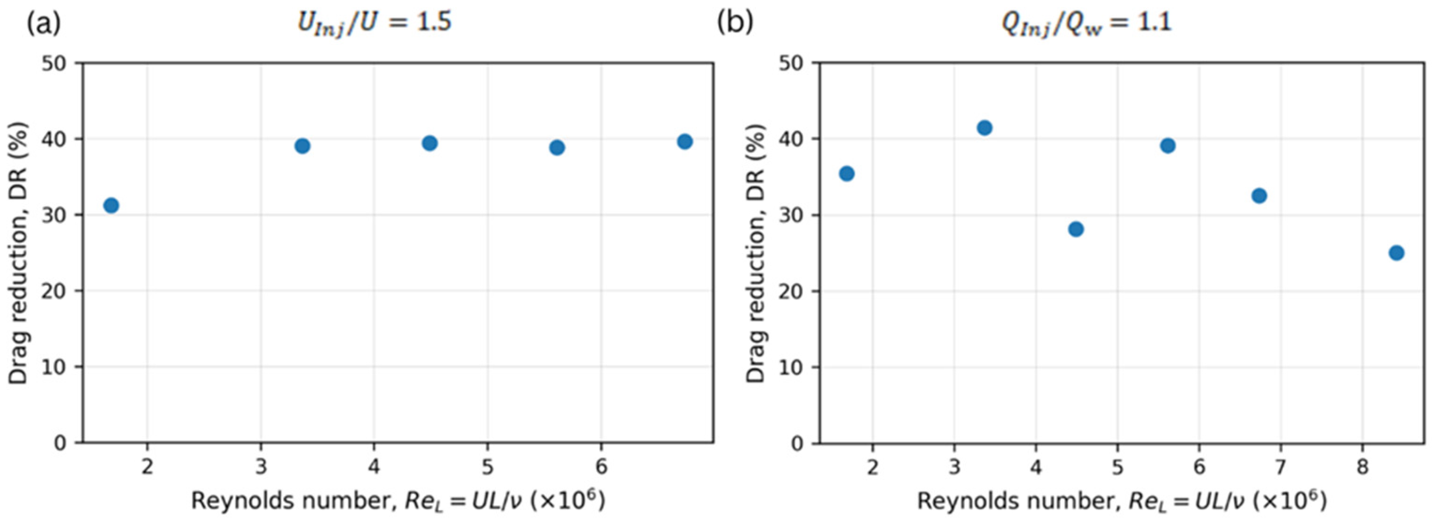 Figure 8. Drag reduction as a function of Reynolds number, ReL, at a fixed non-dimensional injection parameter: (a) injection velocity ratio, UInj/Ub = 1.5, and (b) injection flow rate ratio, Q I n j / Q w = 1.1.