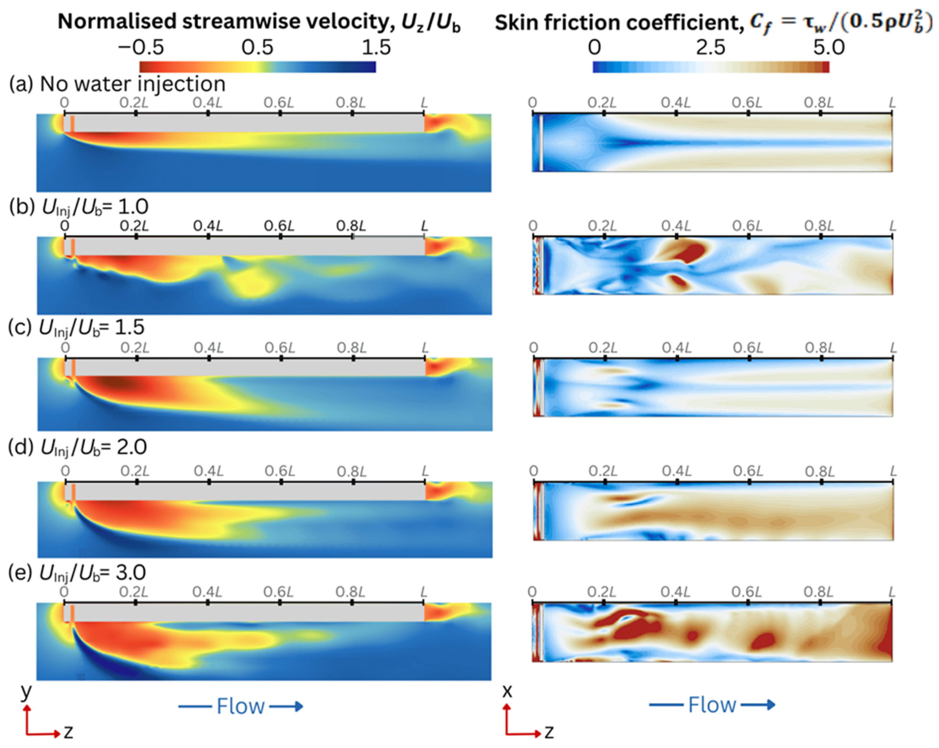 Figure 9. Contours of (left) normalised streamwise velocity, UZ/Ub and (right) skin friction coefficient, Cf at selected injection velocity ratios: (a) No water injection, (b) UInj/Ub = 1.0, (c) UInj/Ub = 1.5, (d) UInj/Ub = 2.0 and (e) UInj/Ub = 3.0.