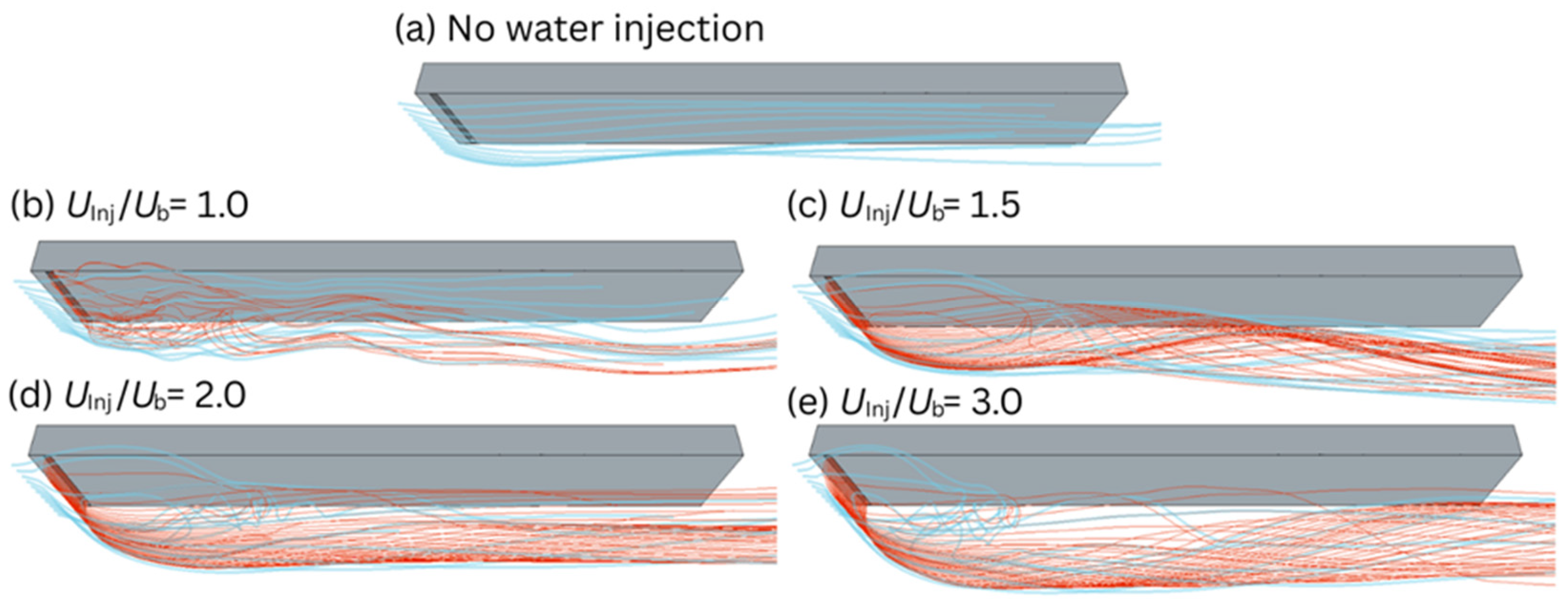 Compared to air lubrication, water lubrication is a relatively underexplored concept. Rather than introducing air—a dissimilar, less dense, and less viscous gaseous phase—water injection utilises the same fluid medium as the bulk flow to modify the boundary layer actively. This distinction is critical because it avoids the limitations of bubble entrainment, stability, and buoyancy effects that plague air lubrication, especially at greater depths or on inclined surfaces. Specifically, water injection reduces drag primarily through modification of skin friction, suggesting applicability across different plate orientations. This offers potential applicability across a wider range of hull geometries, including side walls and deep-draft sections, where air lubrication is less effective. Recent studies suggest two primary mechanisms: (i) controlled induction of flow separation to create a slowly moving or reverse-flowing layer near the wall, thereby reducing shear stress [10] and (ii) modification of velocity gradients to form a low-shear boundary layer [11]. Although flow separation is typically associated with increased drag, these findings demonstrate that, if carefully induced, it can be exploited to reduce wall shear instead. This inversion of a traditionally adverse phenomenon represents a novel direction in hull drag reduction.