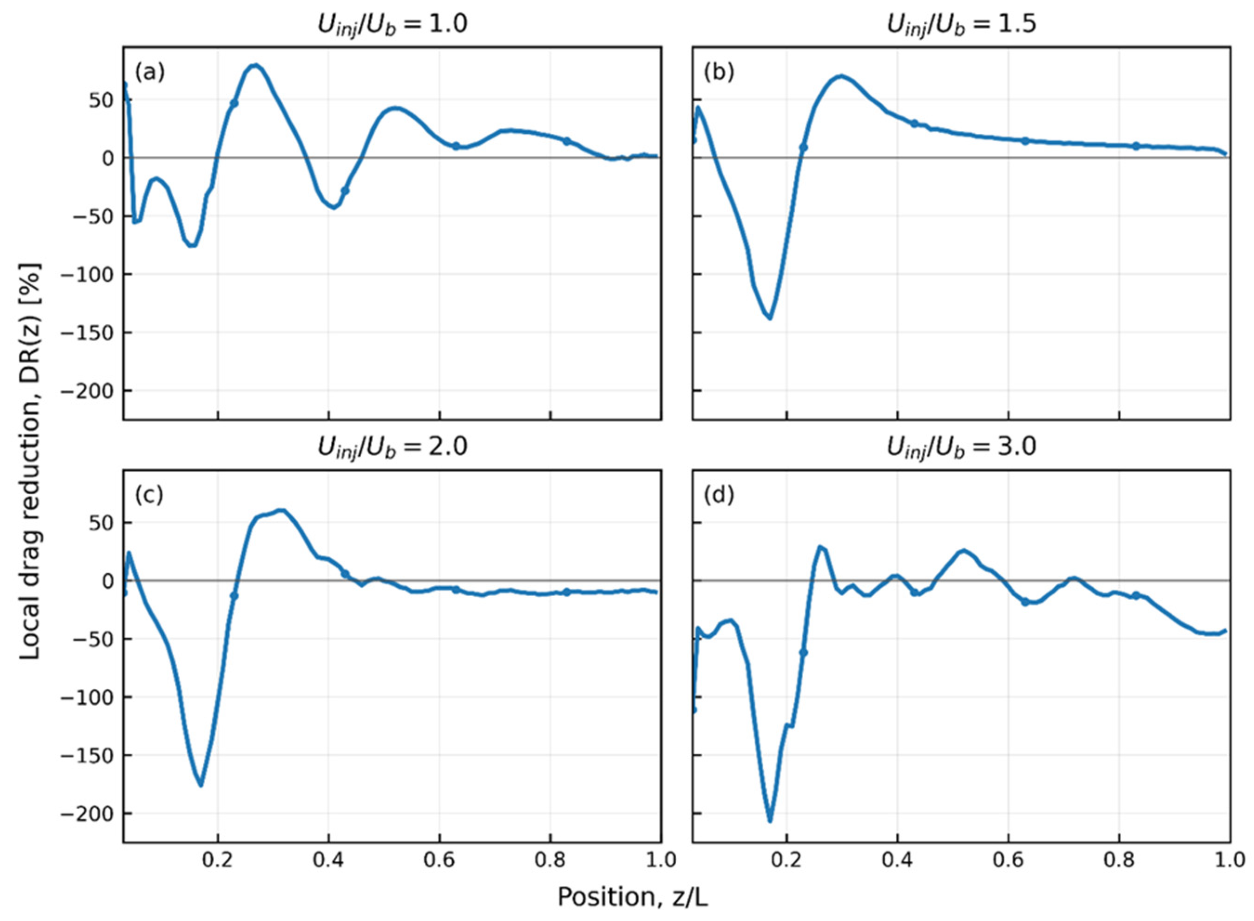 Figure 11. Streamwise distribution of local drag reduction, DR(z), along the plate surface for different injection velocity ratios. Results are shown for (a) U I n j / U b = 1.0, (b) U I n j / U b = 1.5, (c) U I n j / U b = 2.0, and (d) U I n j / U b = 3.0. The horizontal axis is normalised by the plate length (z/L), with z/L = 0 at the slot exit and z/L = 1 at the trailing edge. Positive values of DR(z) indicate local skin-friction reduction relative to the baseline non-injection case.