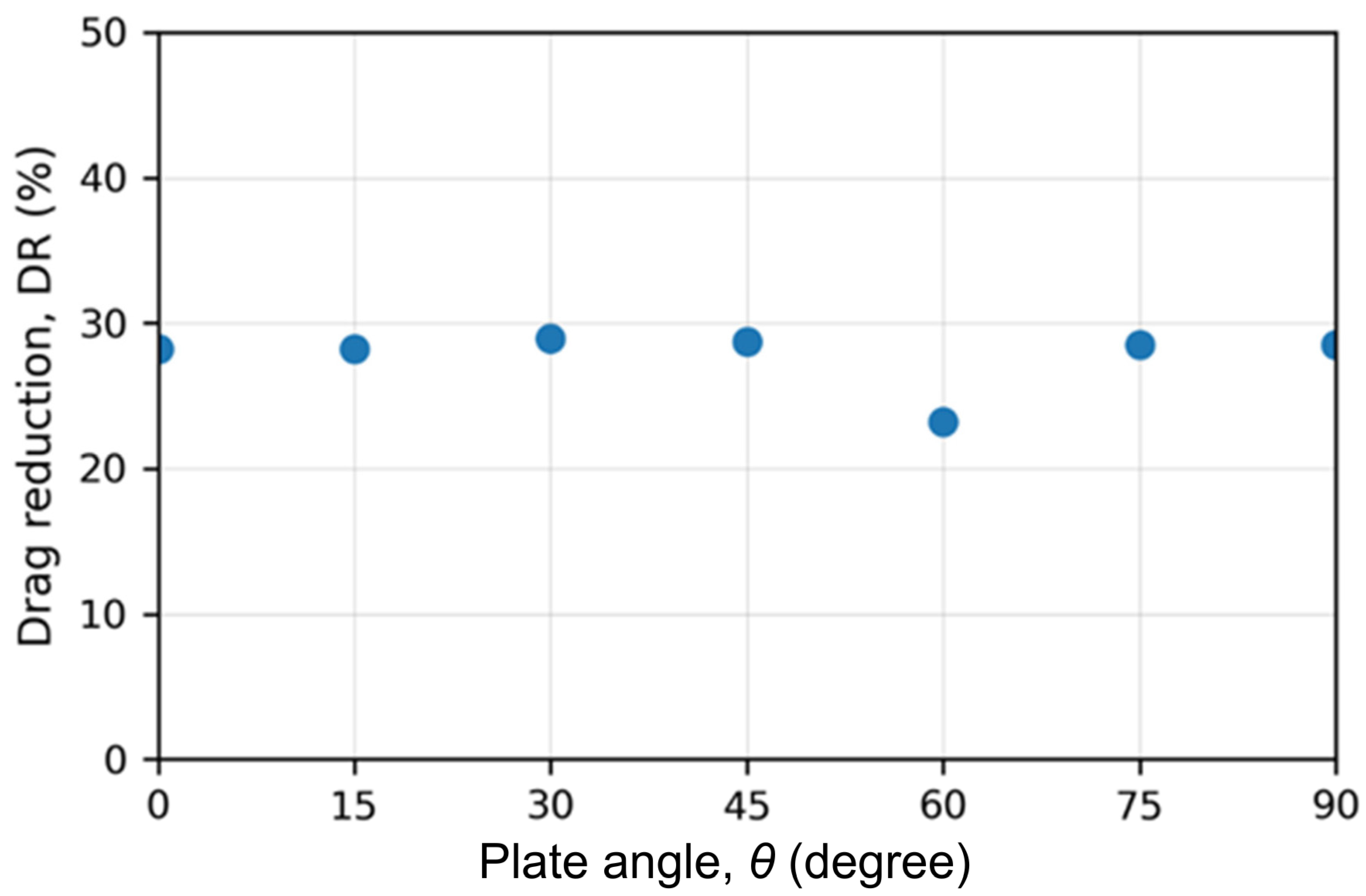 Figure 12. Effect of plate orientation on drag reduction at ReL = 8.42 × 106 and U I n j / U b =1.33.