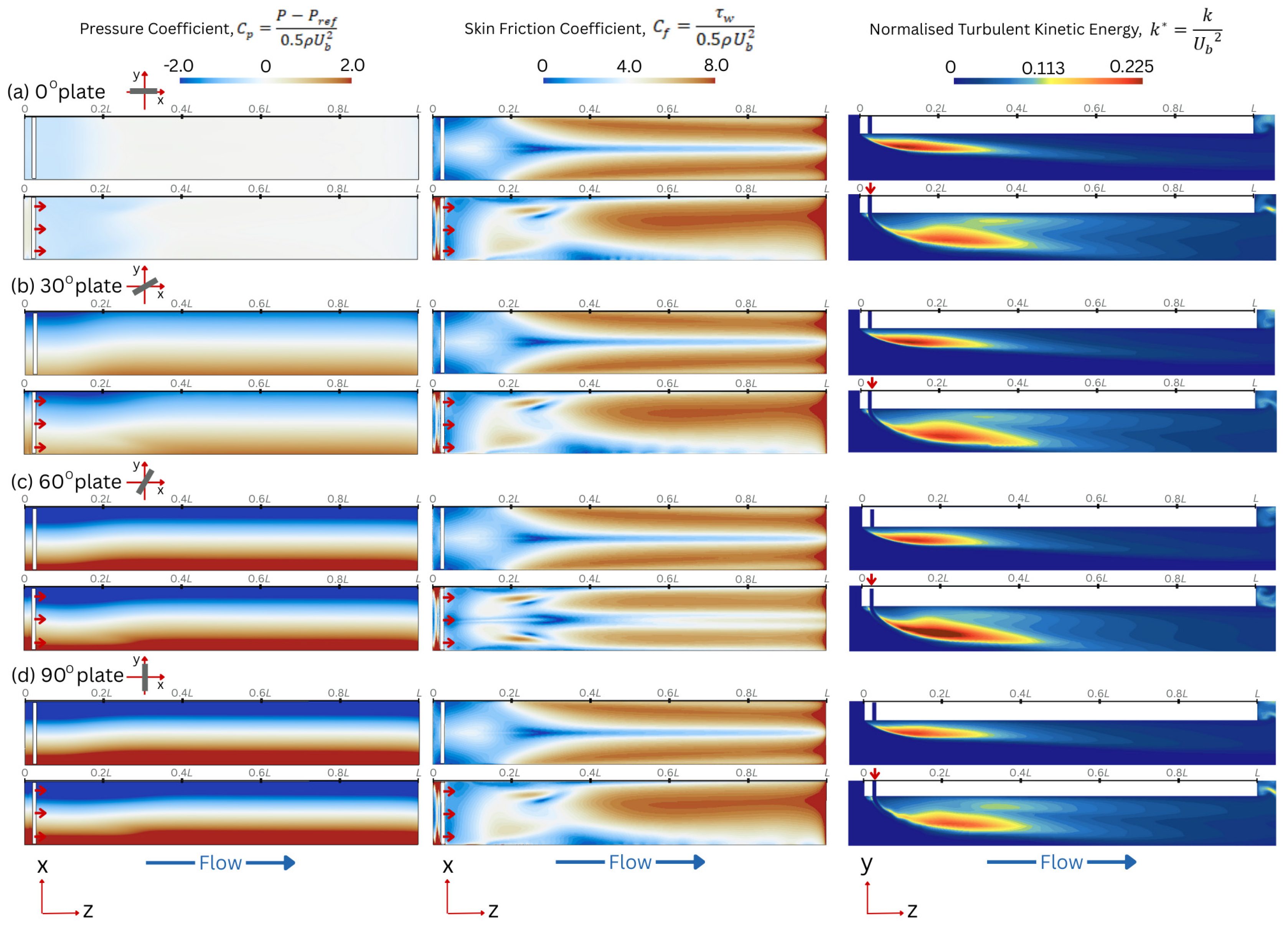 Figure 13. Contours of (left) pressure coefficient, Cp, (centre) skin friction coefficient, Cf, and (right) normalised turbulent kinetic energy, k/Ub,2, at selected plate orientations: (a) 0° (flat plate), (b) 30°, (c) 60° and (d) 90° (vertical plate). Simulations correspond to the highest Reynolds number tested (8.42 × 106) and with an injection velocity ratio, U I n j / U b = 1.33. In each subfigure, the top panel shows the case without injection, and the bottom panel shows the case with injection.