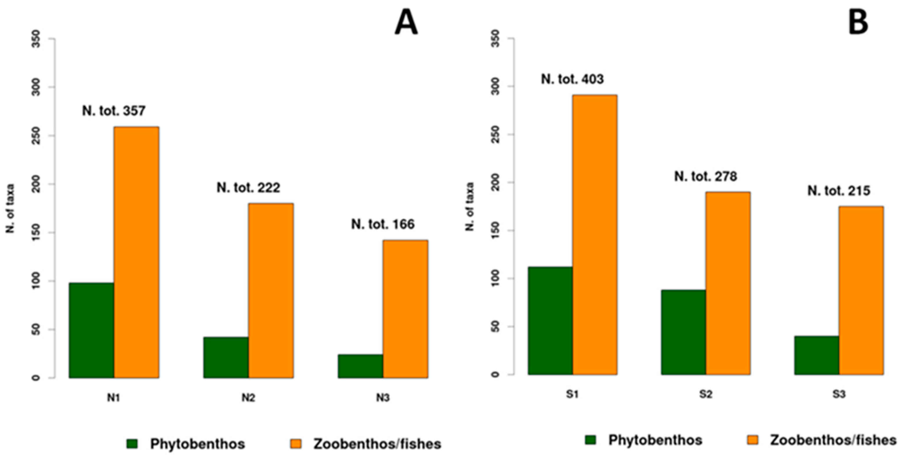 - Esposito, V.; Auriemma, R.; De Vittor, C.; Relitti, F.; Urbini, L.; Kralj, M.; Gambi, M.C. Structural and functional analyses of motile fauna associated to Cystoseira brachycarpa along a gradient of ocean acidification in a CO2 vent system off Panarea island (Aerolian Islands, Italy). J. Mar. Sci. Eng. 2022, 10, 451. [Google Scholar] [CrossRef]