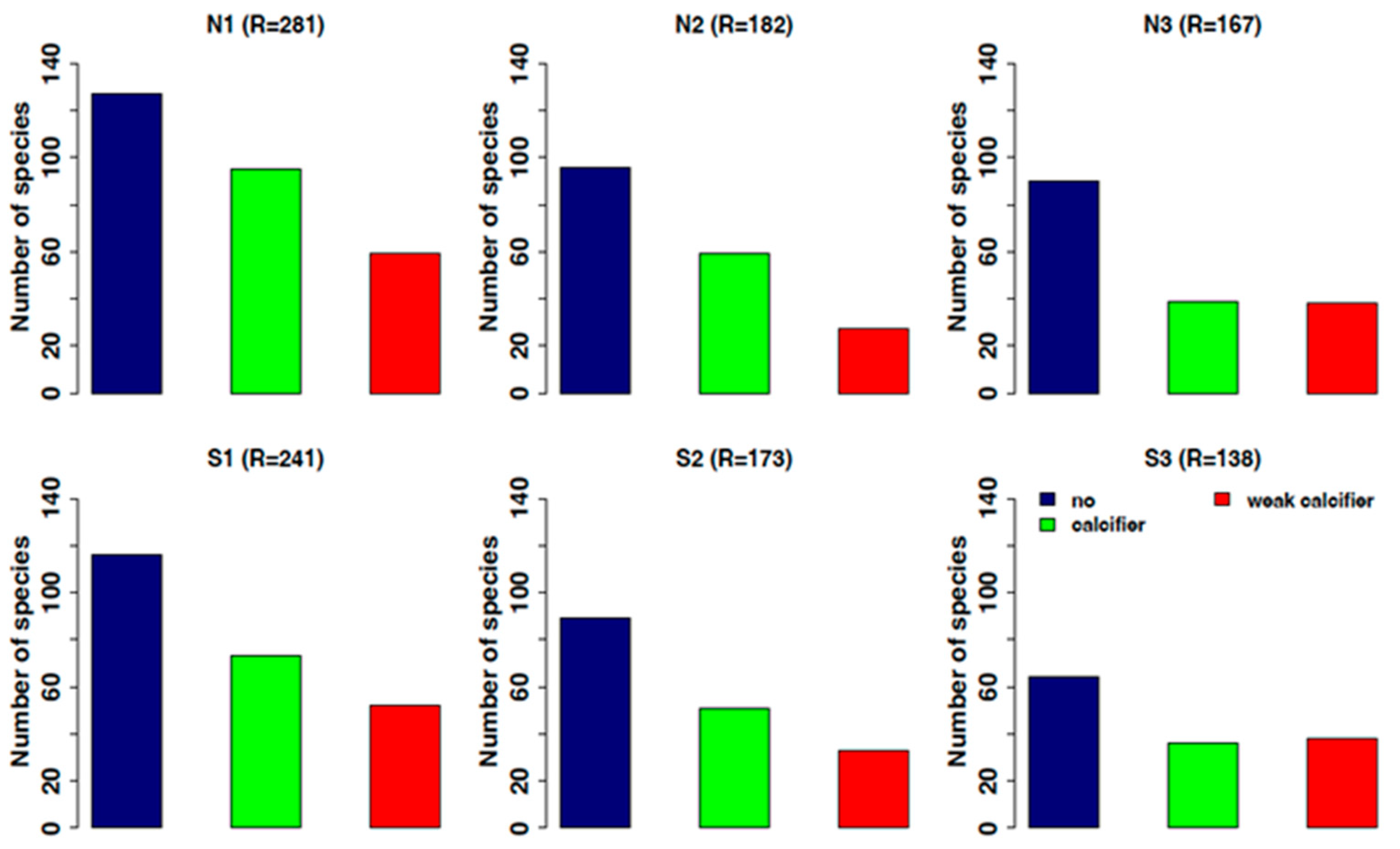 - Teixidó, N.; Carlot, J.; Alliouane, S.; Ballesteros, E.; De Vittor, C.; Gambi, M.C.; Gattuso, J.-P.; Kroeker, K.; Micheli, F.; Mirasole, A.; et al. Functional changes across marine habitats due to ocean acidification. Glob. Change Biol. 2024, 30, e17105. [Google Scholar] [CrossRef]