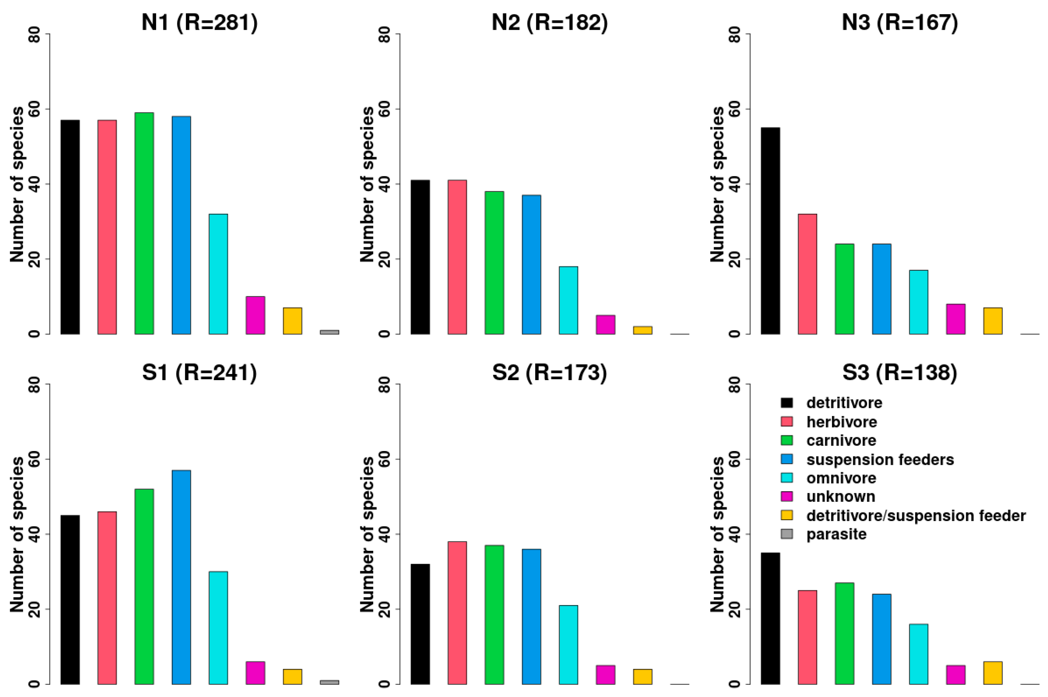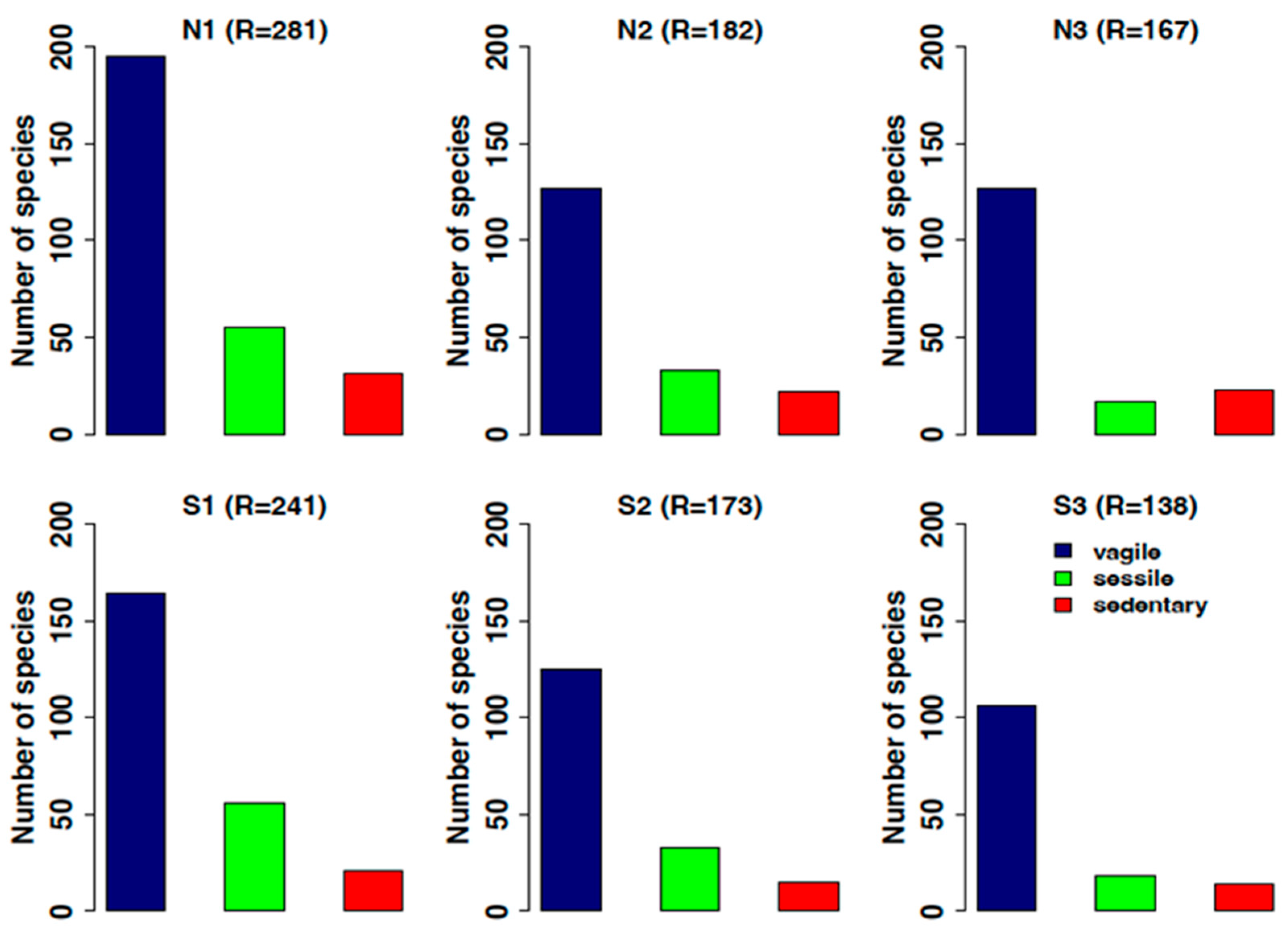 - Gambi, M.C.; Musco, L.; Giangrande, A.; Badalamenti, F.; Micheli, F.; Kroeker, K.J. Distribution and functional traits of polychaetes in a CO2 vent system: Winners and losers among closely related species. Mar. Ecol. Prog. Ser. 2016, 550, 121–134. [Google Scholar] [CrossRef]