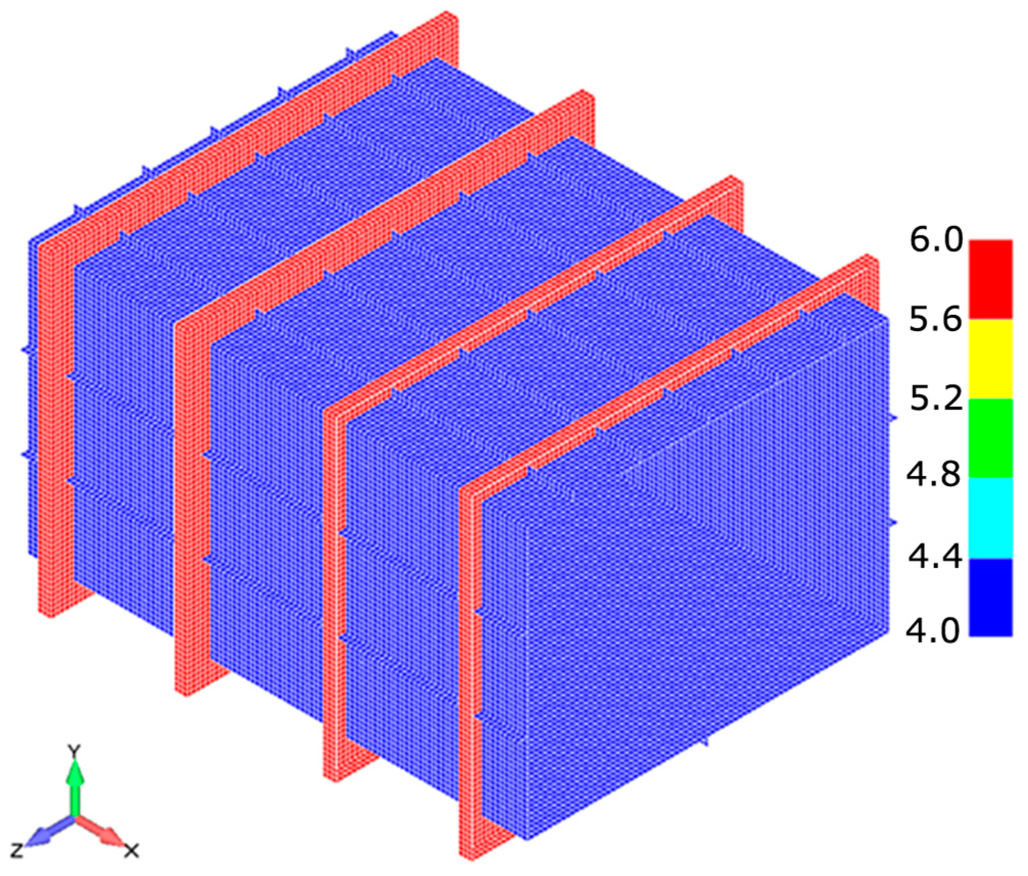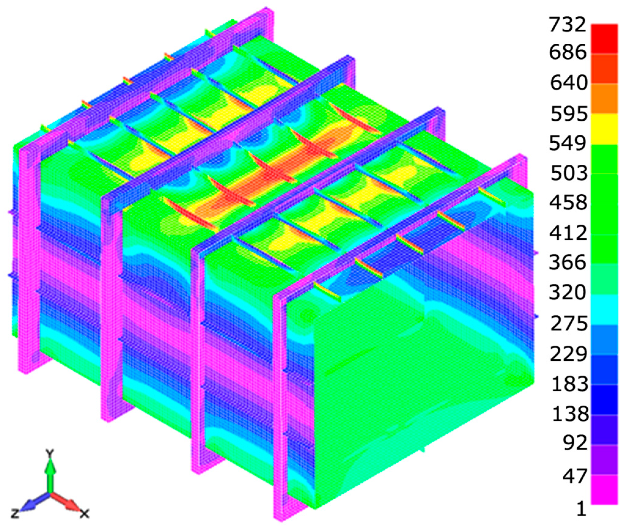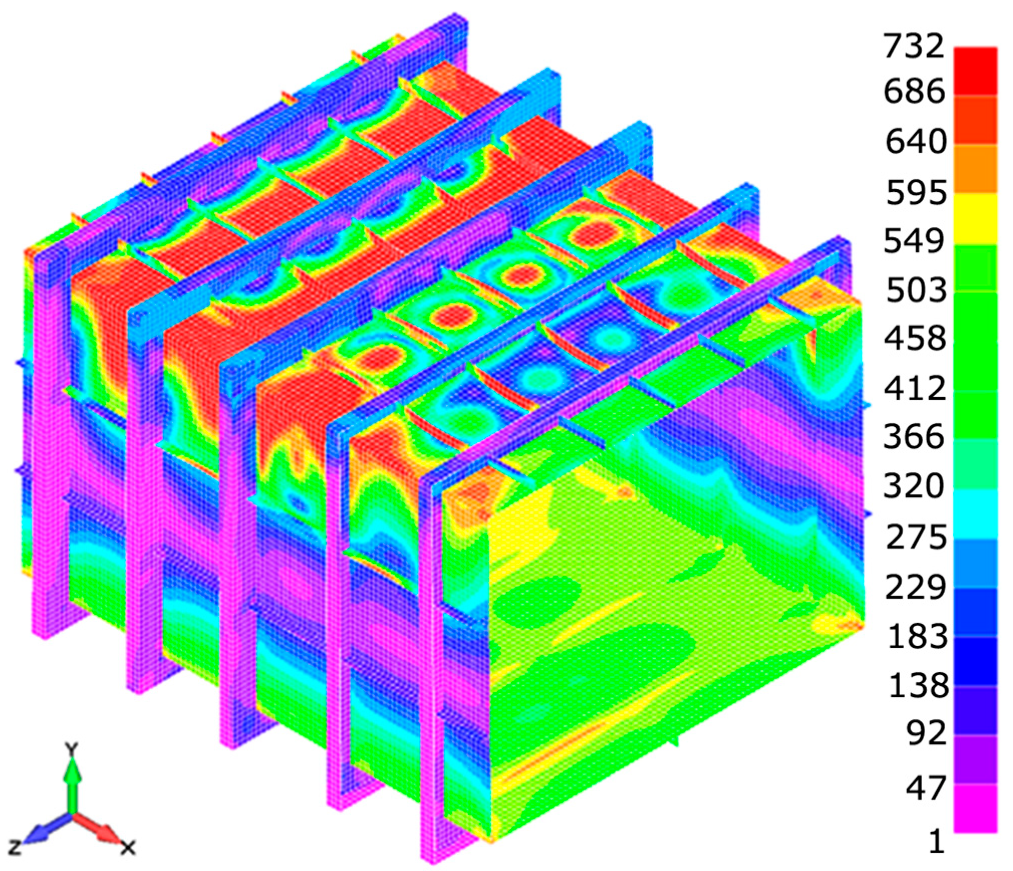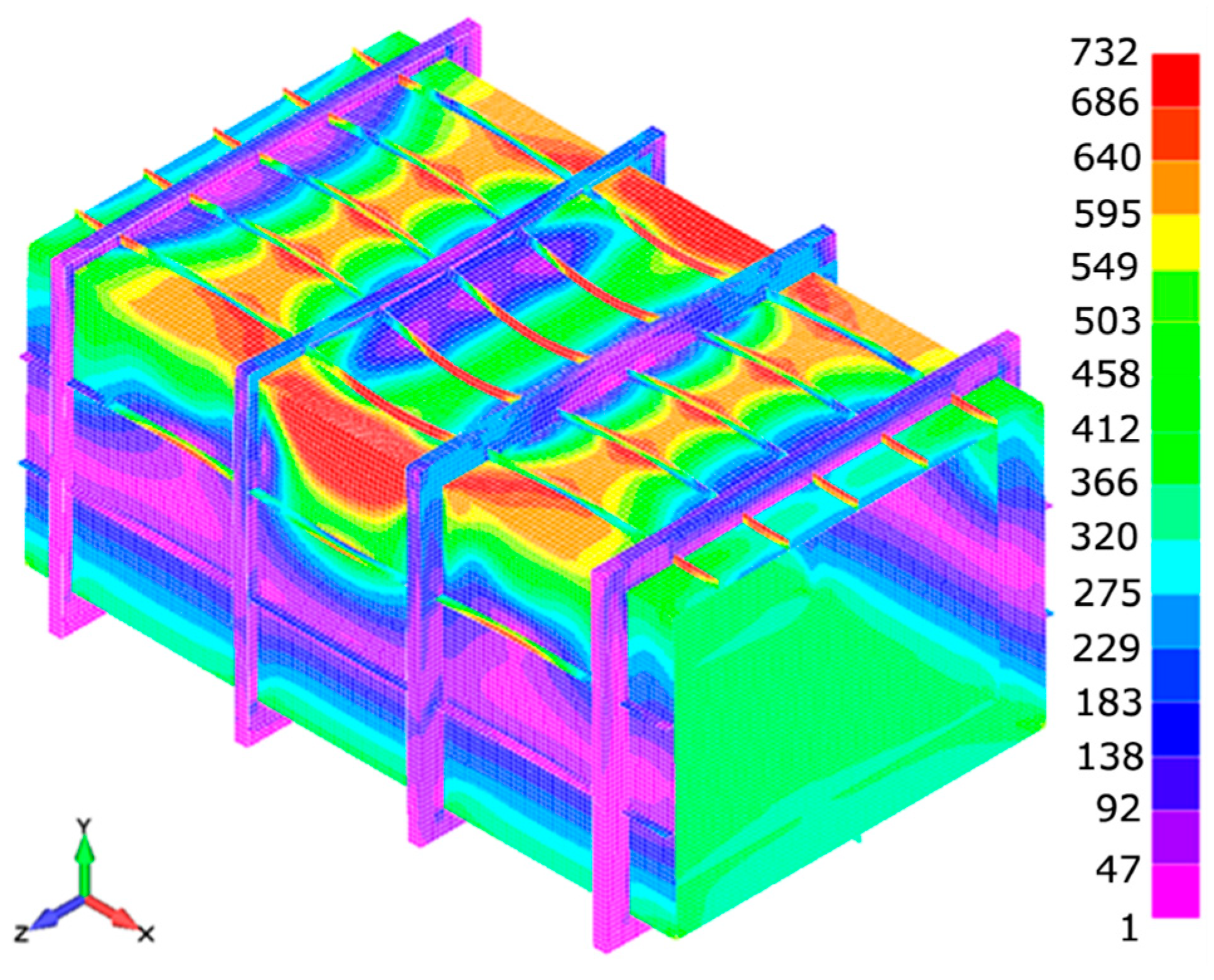Figure 5 represents the discretized H300 model, displaying the thickness of the plate, stiffeners, and transverse frames. Following data given in [