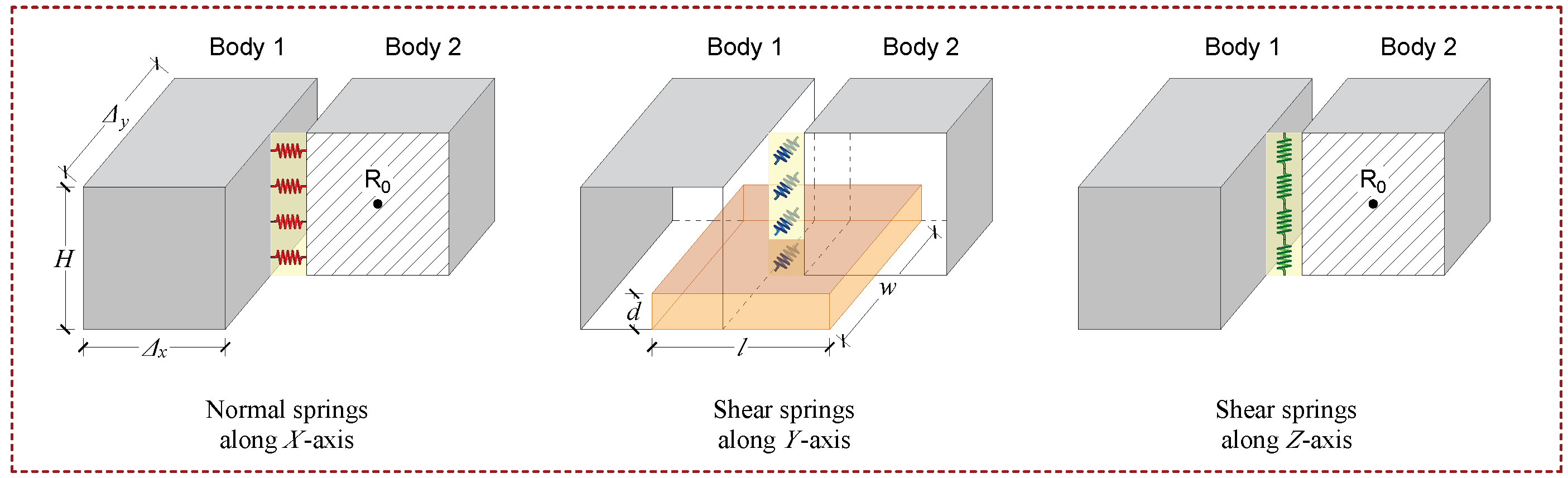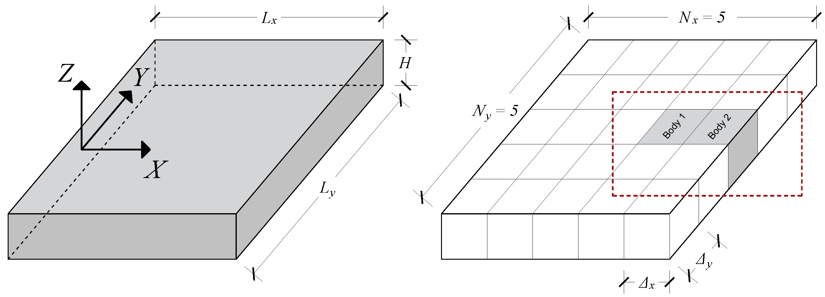 - Structural flexibility of thin floating plates, represented using the Applied Element Method (AEM) incorporated within the SPH–MBD coupling [40,41], enabling the simulation of large structural displacements. The implemented AEM formulation has been validated for both beam and plate configurations under static, dynamic, and hydrodynamic conditions.