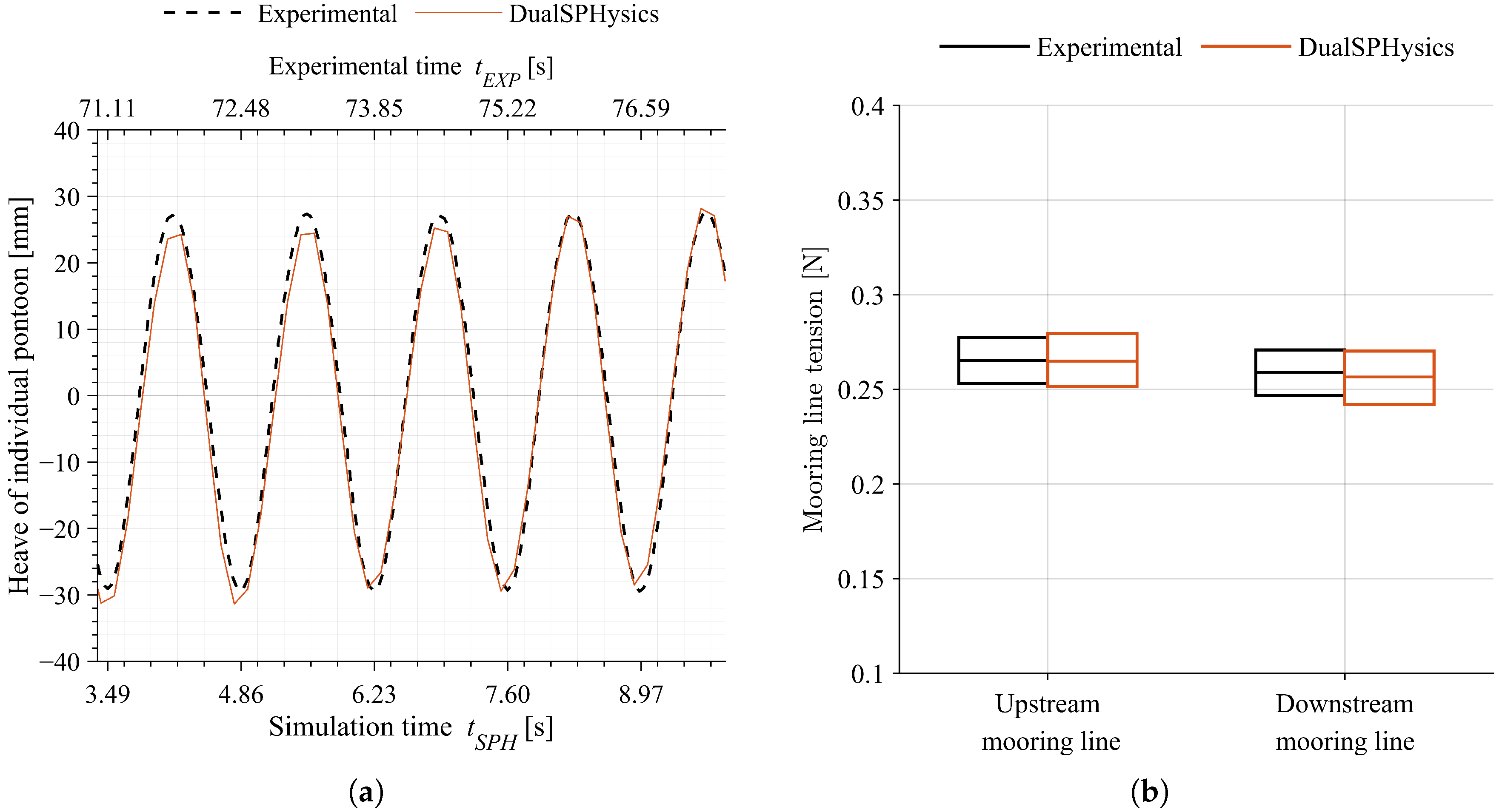 - Mooring line dynamics, resolved through the MoorDyn+ lumped-mass model [56], an enhanced implementation of the original MoorDyn framework [57]. The model resolves the dynamic equilibrium of mooring lines and flexible connectors under external hydrodynamic forcing while being two-way coupled with the SPH solver [52] to accurately capture interactions between moored floating structures and non-linear wave excitation.