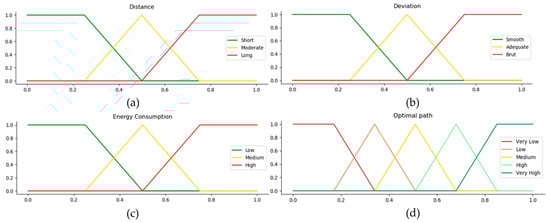 Membership functions of (a) normalized distance, (b) deviations among the path, (c) fuel consumption, and (d) path optimality.