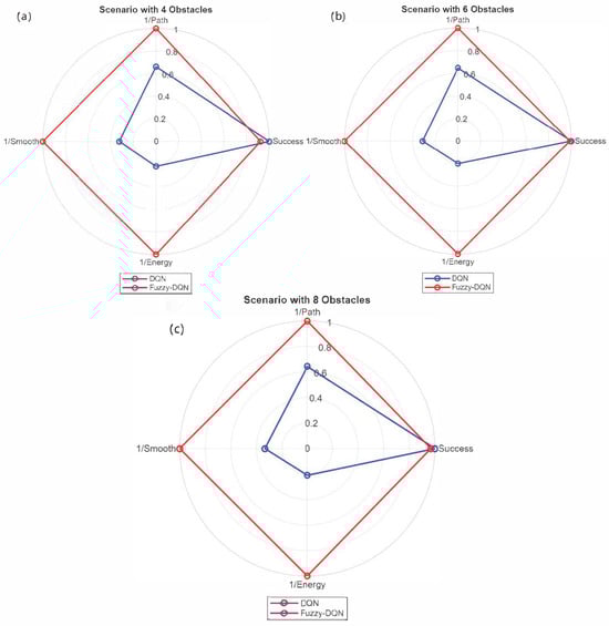 As environmental complexity increases (from four to eight obstacles), both agents maintain relatively stable success rates, indicating strong generalization capabilities. However, the relative advantage of the F-DQN in smoothness and energy metrics remains consistent, confirming that the integration of fuzzy logic improves multi-objective balance without compromising task completion reliability.