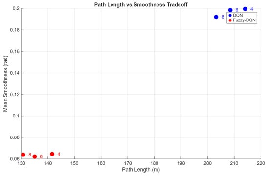Figure 6 illustrates the trade-off relationship between the average path length and the mean smoothness achieved by the two agents across all tested scenarios. Each point corresponds to a specific obstacle configuration (4, 6, and 8 obstacles), annotated accordingly. As observed, the F-DQN agent consistently occupies the lower-left region of the plot, indicating shorter and smoother trajectories, whereas the baseline DQN solutions are positioned toward the upper-right region, corresponding to longer and less stable paths. This demonstrates the effectiveness of the fuzzy reward mechanism in balancing competing objectives—distance minimization and trajectory smoothness—without explicit multi-objective optimization. The F-DQN’s ability to generalize across different levels of environmental complexity also reflects its capacity for context-sensitive decision-making, as the fuzzy inference system dynamically adjusts reward contributions from progress, energy use, and deviation. By contrast, the baseline DQN often overemphasizes goal convergence, leading to sharper turns and redundant maneuvers. Overall, the trade-off scatter confirms that the Fuzzy DQN yields more energy-efficient and kinematically feasible paths, which are particularly desirable for real-world autonomous surface vehicle navigation, where stability and efficiency are critical.