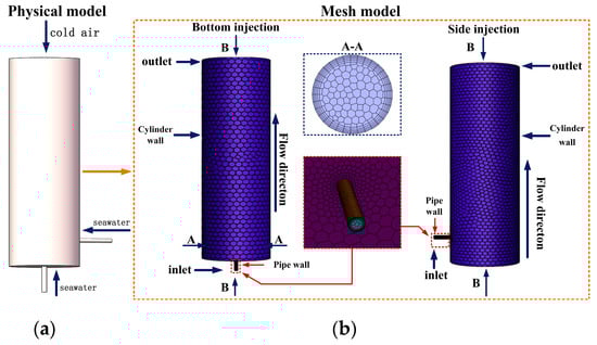 The computational domain of the ballast tank primarily comprises the tank zone, bottom injection zone, and sidewall injection zone, as illustrated in Figure 1a. The injection pipe measures 500 mm in length and 150 mm in diameter, while the water storage cylinder has a height of 8 m and radius of 1 m. SolidWorks 2023 was employed to construct the geometric model of the internal fluid domain, with ANSYS Fluent Meshing 2023 R1 implementing a systematic meshing strategy. Local grid refinement was applied to near-wall regions, combined with multilayer boundary grids to accurately resolve phase-change heat transfer characteristics and flow details within the boundary layer. Ultimately, a high-quality computational mesh dominated by unstructured grids was generated, maintaining a strict minimum global grid size of 0.005 mm (Figure 1b). Supercooled seawater enters the ballast tank through injection pipelines driven either by ballast pumps or by gravity-driven flow. During injection, ventilation pipes or tank hatches must remain open to maintain atmospheric pressure connection, causing rapid temperature drops within the tank. When supercooled seawater flows over ultralow-temperature walls, it triggers phase change to form ice crystals adhering to inner surfaces. Continuous ice accumulation thickens the layer, ultimately leading to complete pipeline blockage.