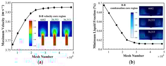 The effect of mesh density on the flow freezing process: (a) variation in maximum flow velocity with mesh density; (b) variation in minimum liquid volume fraction with mesh density. The specific location of Section B-B is shown in Figure 1.