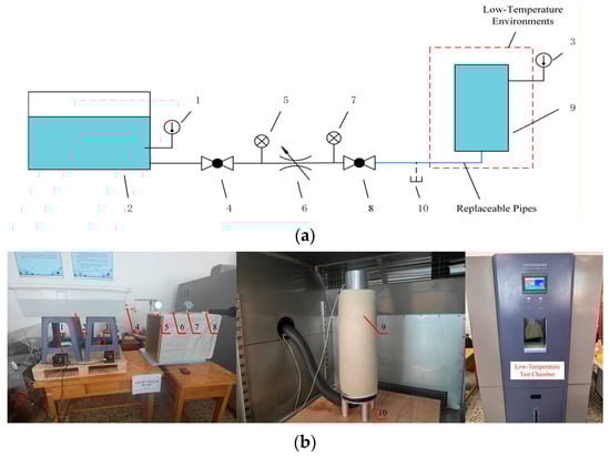 The test bench for investigating dynamic seawater icing and ice blockage consists of three subsystems: flow control, ambient temperature control, and monitoring and acquisition. As shown in Figure 4, the flow control system includes a water source, pipes, a storage cylinder, globe valves, and pressure gauges (Shanghai Jiangyue Instrument Factory, Shanghai, China). Water injection rate is regulated by adjusting the valve opening, while the flow state is monitored in real time via pressure gauges. The ambient temperature control system is built around an SHK-B101 programmable climate chamber (Jianzhuo Instrument Technology Co., Ltd., Suzhou, Jiangsu, China), which accurately simulates polar conditions by controlling the temperature and humidity around the cylinder. To mimic actual ship pipeline conditions, the cylinder and pipes are wrapped with thermal insulation. The monitoring system comprises temperature sensors (Sains Instrument Co., Ltd., Suzhou, Jiangsu, China), stopwatches, cameras (Songdian Technology Co., Ltd., Foshan, Guangdong, China), and a high-precision electronic balance (Sains Instrument Co., Ltd., Suzhou, Jiangsu, China). Ice formation is recorded visually, and icing boundaries in images are extracted using Origin 2024 for thickness calculation with a correction algorithm. Flow-through time is measured with a stopwatch, and injected water mass is weighed electronically. The relationship between flow time and rate is subsequently computed in MATLAB R2023a.