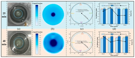 At 219 K: A-A cross-section ice layer validation at different times (a) shows the actual icing situation of the A-A cross-section in the experiment. Blue represents the cylinder wall, and light blue represents the ice layer. (b) shows the corresponding liquid volume fraction distribution in the simulation. (c) shows the simulated icing condition, with black representing the cylinder wall and blue representing the ice layer. (d) shows the calculation errors of ice layer thickness at four points (data 1–4) in both the experiment and the simulation.