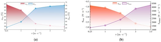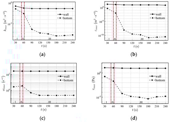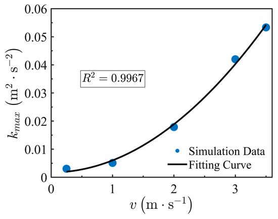 For bottom-center injection, the axisymmetric vertical jet confines turbulence generation and heat transfer to the bottom core region. The cylindrical wall’s confinement is negligible because the jet, being coaxial with the tank, fully develops before reaching the wall, resulting in minimal shear disturbance to the core flow. Therefore, for the central bottom water injection condition, the analysis focuses only on the evolution of parameters at the cylinder bottom. As shown in Figure 10 and Figure 11, the maximum turbulent kinetic energy (kmax) and shear stress (εmax) at the cylinder bottom increase significantly with velocity. The fitting formulas are given as follows: