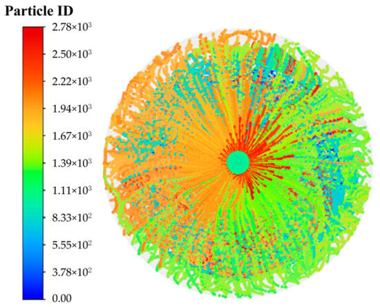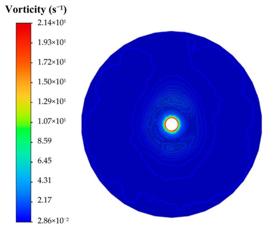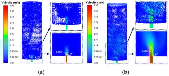 As shown in Figure 9, under a fixed injection time of 240 s, as the injection velocity increases from 1.0 m/s to 3.5 m/s, the flow field remains in a fully developed turbulent state. The radial streamlines and vortex structures induced by secondary flow become increasingly distinct. This behavior stems from the increased initial kinetic energy of the jet, which enlarges the velocity gradient between the jet and the surrounding fluid. According to viscous shear theory, a greater velocity gradient enhances momentum exchange between adjacent layers, thereby intensifying secondary flow and vortical motion. The velocity contour indicates that the jet core length decreases with increasing velocity: from 0.38 m at 1.0 m/s to 0.12 m at 3.5 m/s. Concurrently, the jet angle increases from 14° to 32°, indicating stronger lateral turbulent diffusion. Physically, the higher momentum flux at elevated velocities promotes more intense mixing with the ambient fluid, leading to rapid erosion of the jet core. The larger jet angle further confirms enhanced radial spreading, as the jet overcomes resistance from the surrounding fluid.
