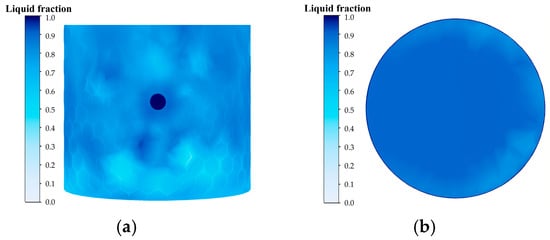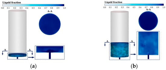 The scale-down model was constructed and meshed using the same methodology as the full-scale model. The time-dependent flow rate curve measured experimentally at 219 K was applied as the velocity inlet boundary condition. As shown in Figure 6, water injection ceases at approximately 25 min. Subsequently, phase change intensifies at the cylinder bottom, with the resulting ice crystal slurry expanding toward the cylinder wall where local icing begins, accompanied by decreased liquid surface clarity. By approximately 40 min, icing further develops at both the bottom and wall regions. Comparative analysis confirms that the simulation effectively captures the temporal evolution of ice morphology and thickness distribution in the water storage cylinder. Section A-A, a horizontal cross-section 5 mm above the cylinder bottom, was monitored for liquid volume fraction. A value ≤ 0.05 indicates the formation of a solid clear ice region. The simulated ice thickness derived using this criterion shows an average error of only 7.6% compared to image-based measurements, falling within an acceptable range and verifying the high reliability of the numerical model.