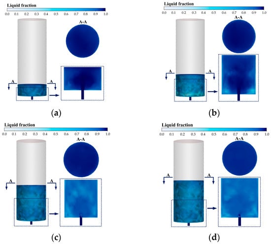 Simulation results further reveal distinct regional differentiation in the thermodynamic response during sidewall injection. As shown in Figure 29a–d, the cylinder wall region consistently sustains high heat transfer coefficients and total heat flux. With continuously increasing ice fraction and decreasing liquid volume fraction, this area establishes itself as the core zone for phase change and heat transfer. The phase change intensity here is significantly higher than in the wall region under central bottom injection (αice: 0.742 vs. 0.495), primarily because the sidewall jet directly impinges on and adheres to the wall, forming a thin liquid film that substantially reduces thermal resistance and facilitates rapid cooling transfer from the wall to the fluid.