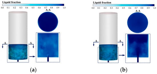 The gas–liquid interface is identified as the iso-surface where the liquid volume fraction equals 0.5, a conventional criterion in VOF-based gas–liquid interface reconstruction [24]. This value represents the midpoint of the phase transition region and provides a consistent reference for interface tracking. A geometric reconstruction scheme with a piecewise-linear representation is employed to accurately capture the interface based on the volume fraction distribution in each cell.