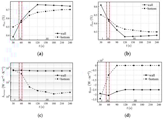 Relationship of thermodynamic parameters: (a) ice fraction, (b) liquid fraction, (c) heat transfer coefficient and (d) total heat flux with time under the condition of sidewall water injection with an injection velocity of 3.5 m/s.